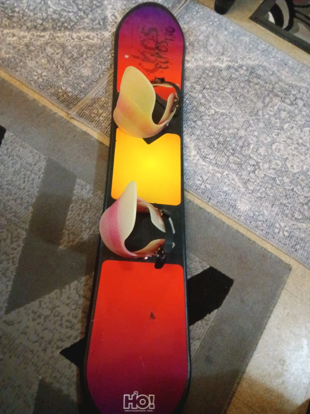 This is an HO! Recreation Inc. snowboard. It has colourful graphics and bindings attached. This board's design is suitable for recreational snowboarding.