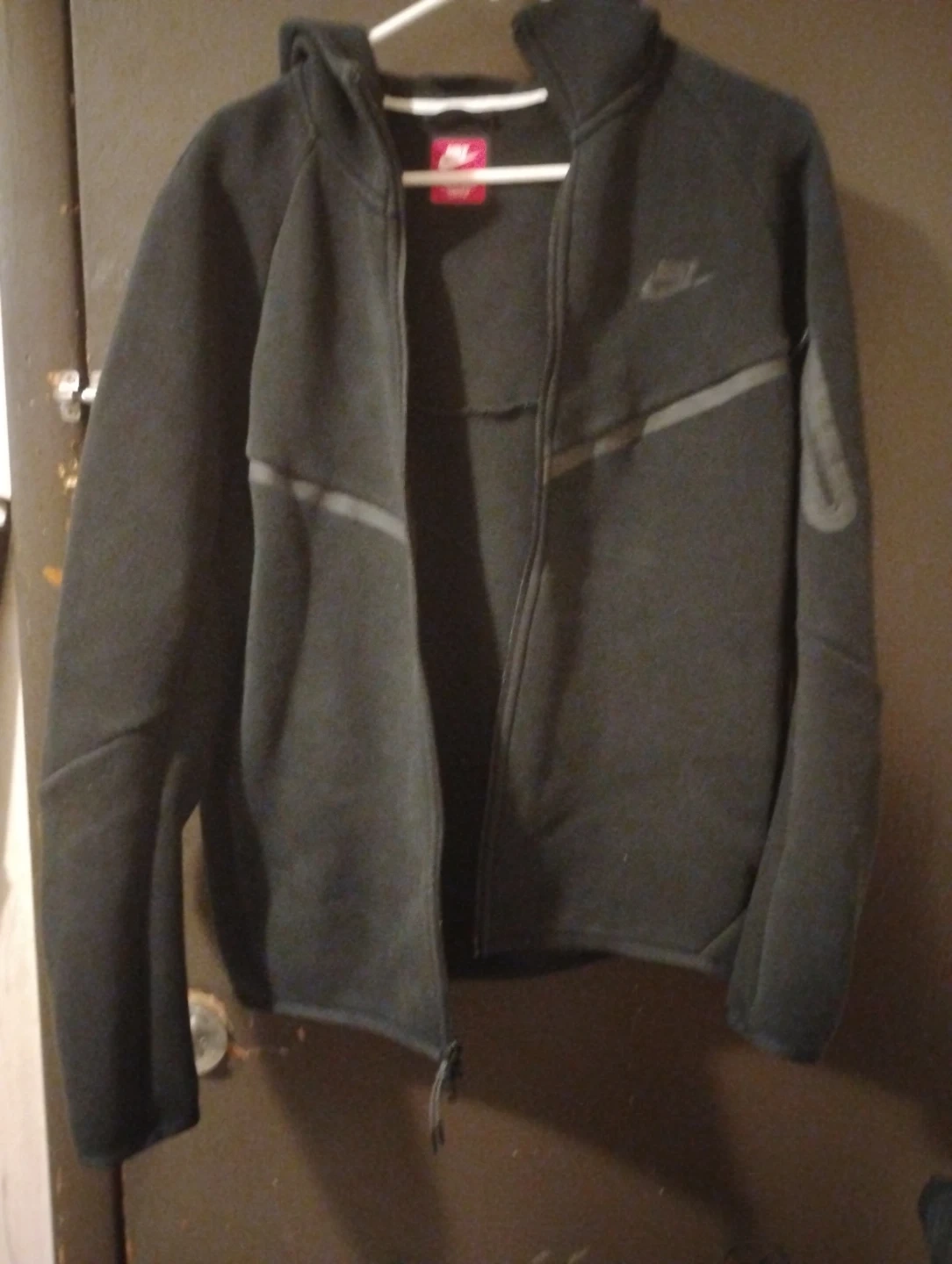 A Nike Tech Fleece full-zip hoodie in black. Features the signature Tech Fleece material for warmth and breathability. It has a full zip closure and a hood.