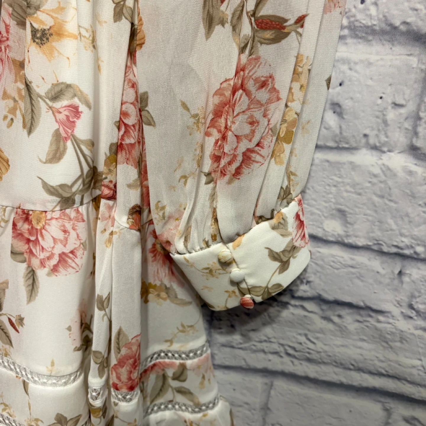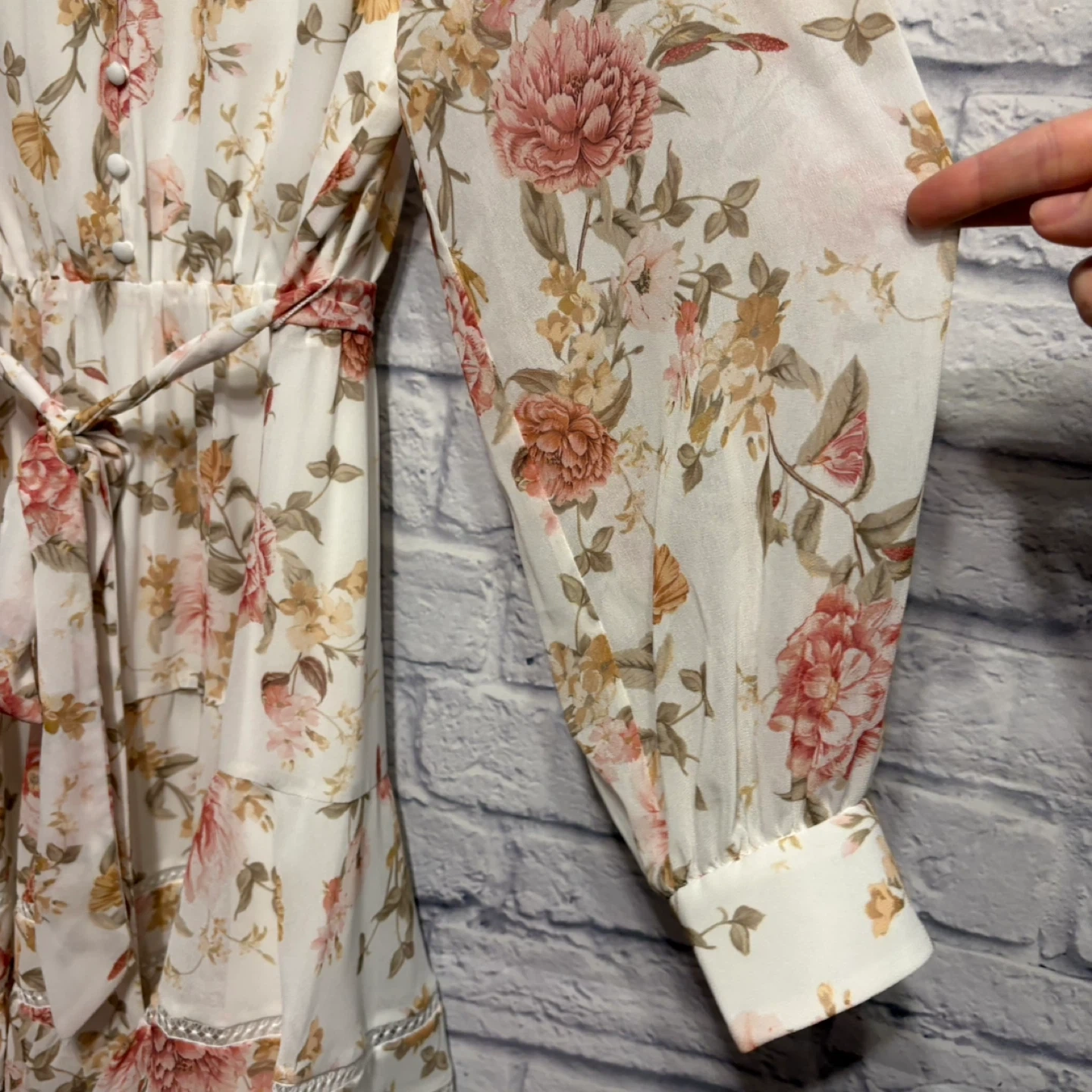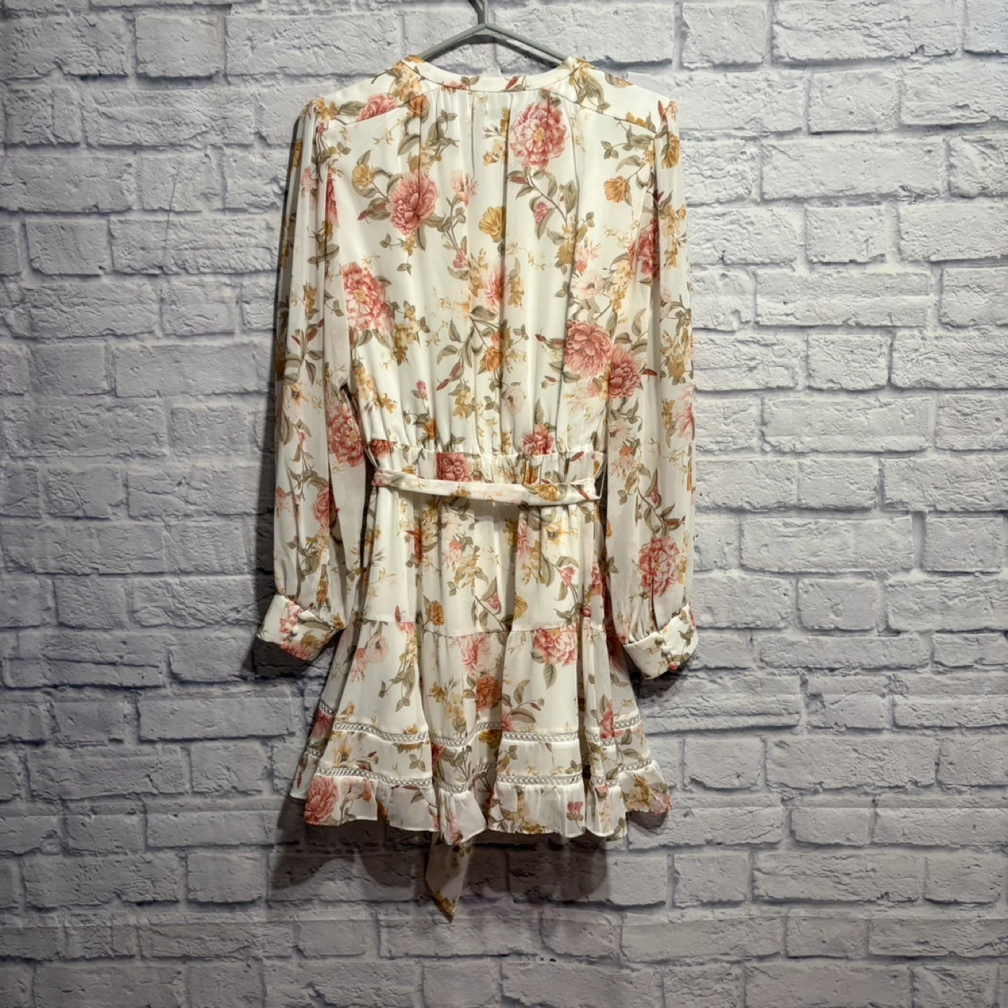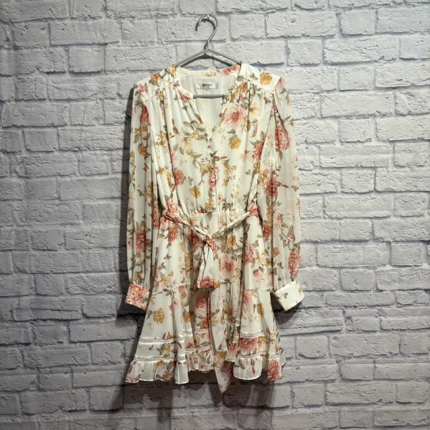 This is an Ever New Petite midi dress with a beautiful floral print. It features a V-neck with button detailing and a tie waist. The fabric is lightweight and perfect for warmer weather. Pick up only.