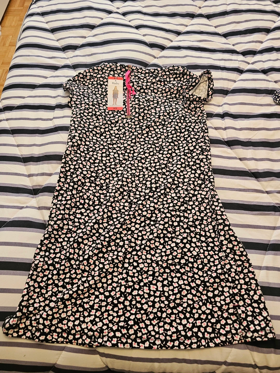 This Hatley girls' dress features a black background with a small white and pink floral print. It's a size Medium/Medium. The dress has short sleeves and a zip-up detail at the neck. It's perfect for casual wear or for a day out!
