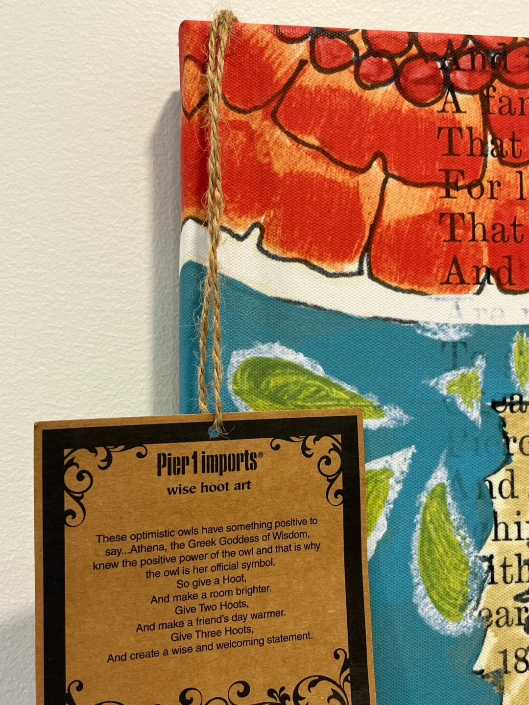 This Pier 1 Imports canvas art features a wise owl design on a teal background with floral accents. The owl is perched on a branch, and elements of text are incorporated into the artwork. It's a charming piece that adds a touch of personality to any room!