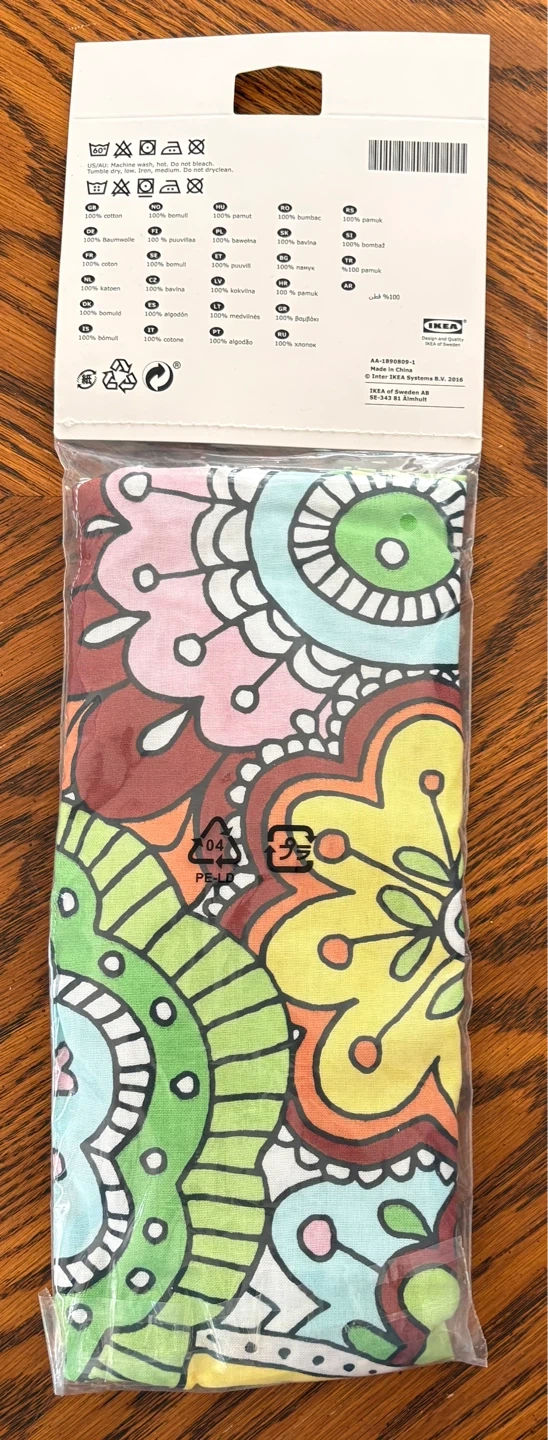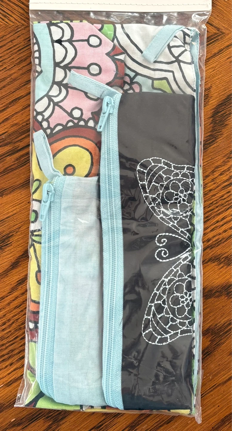 This is a set of three VÄNSKAPLIG zipper bags from IKEA. They feature a colourful floral and butterfly design. The bags are made of 100% cotton. They're great for organizing small items!