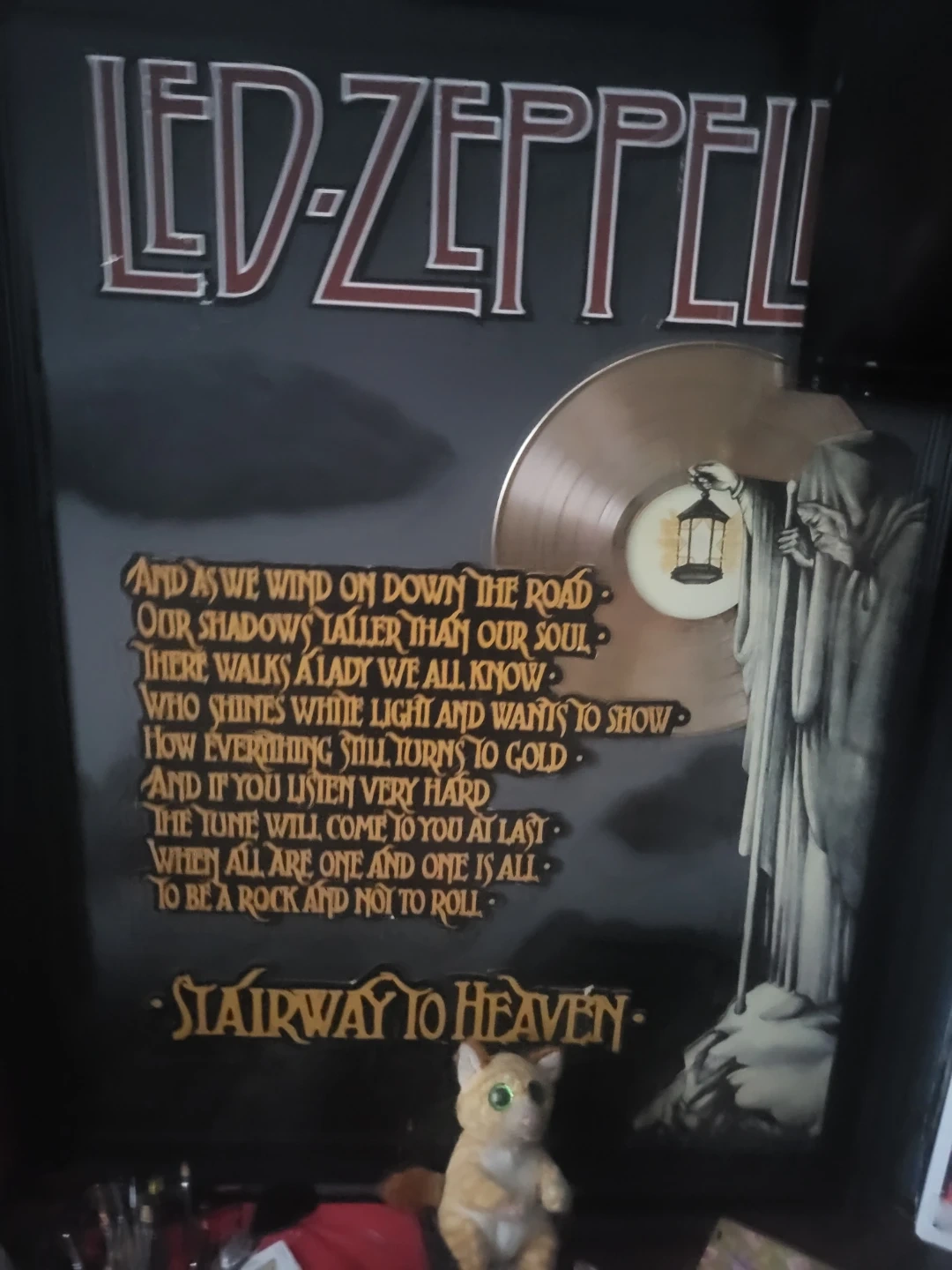This framed art piece features the iconic LED Zeppelin logo and lyrics from "Stairway to Heaven." It includes a gold-coloured record and a depiction of a robed figure. A great piece for any rock music fan!