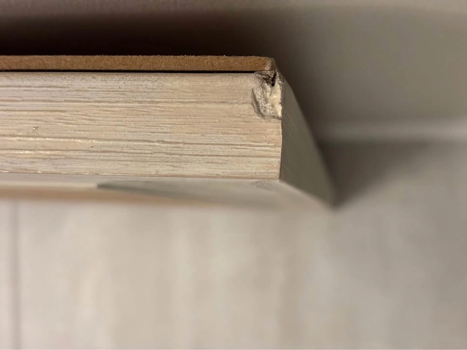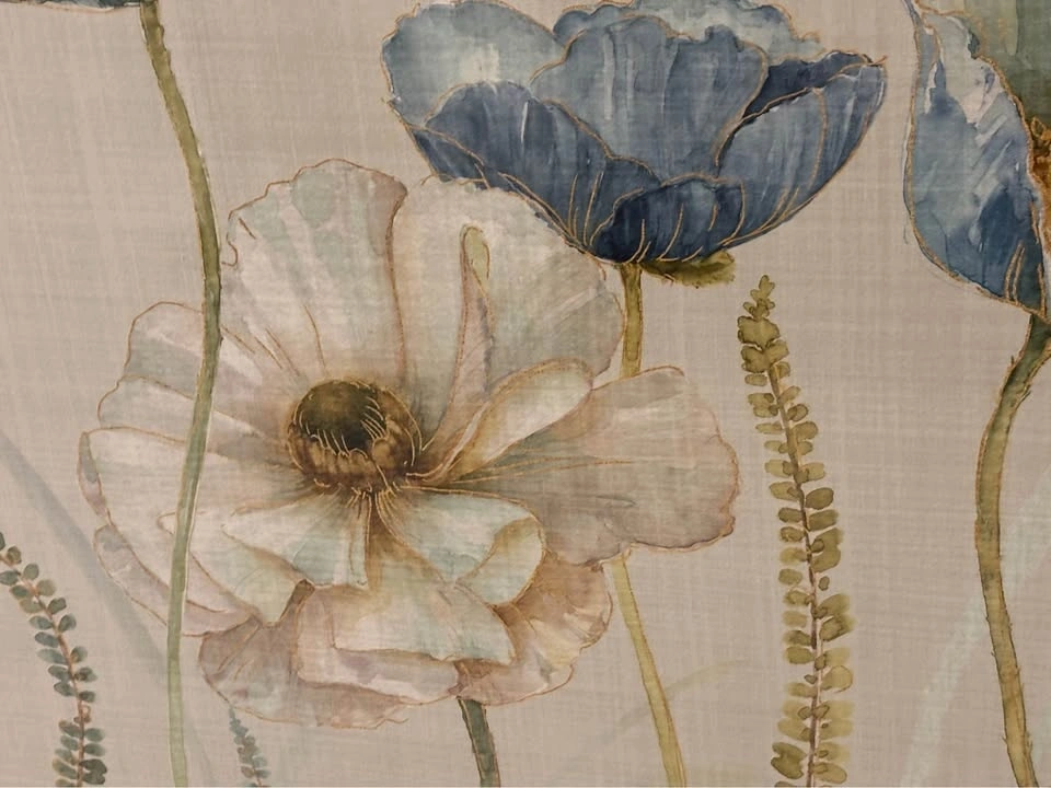 Pretty blue flowers in a meadow, shiny surface. Beige beveled frame. 27.5" w x 33.5" h. See last pic for condition noted on top back of the frame, otherwise good condition.
