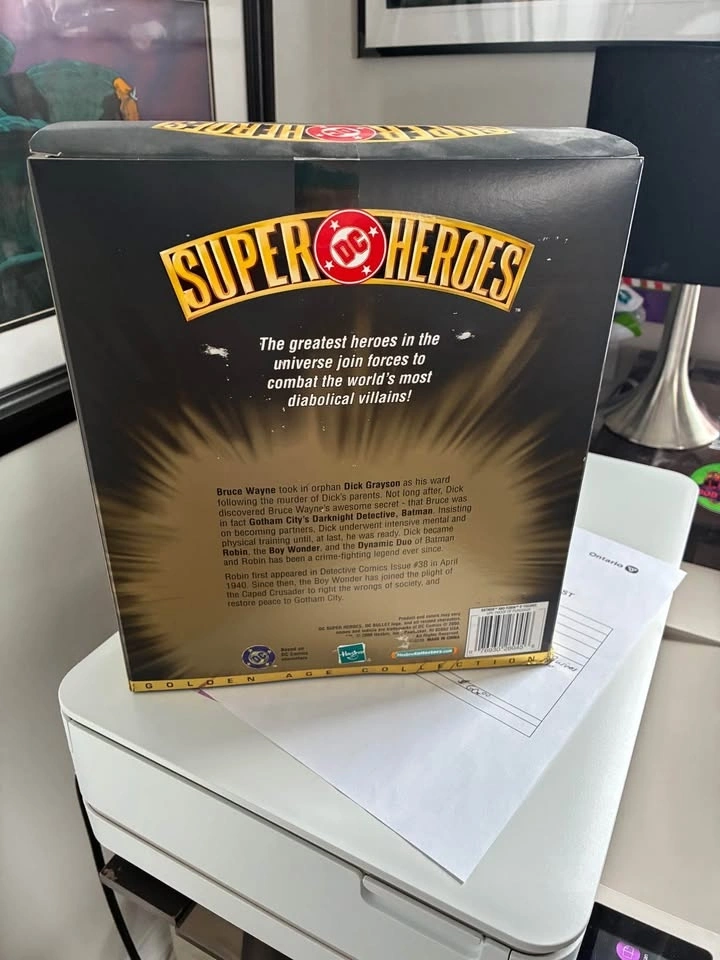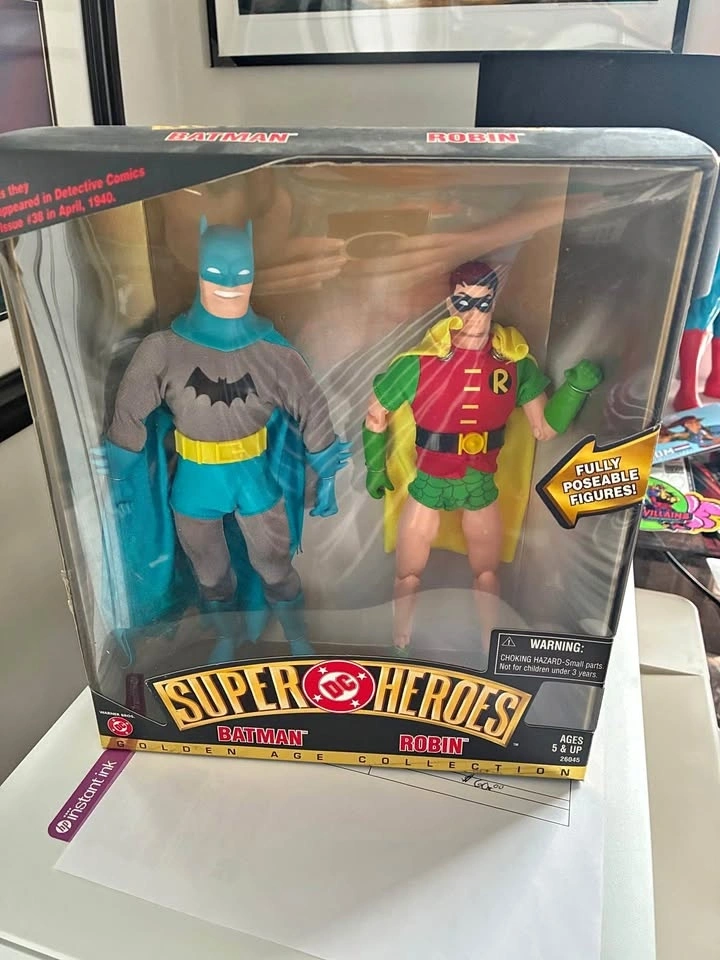 This is a Hasbro DC Super Heroes Golden Age Collection Batman & Robin figure set. The set features fully poseable, 8-inch tall figures with cloth outfits. The figures depict the characters as they appeared in Detective Comics Issue 130 in April 1940. The set was released by Hasbro around the year 2000. Feel free to message if you have any questions!
