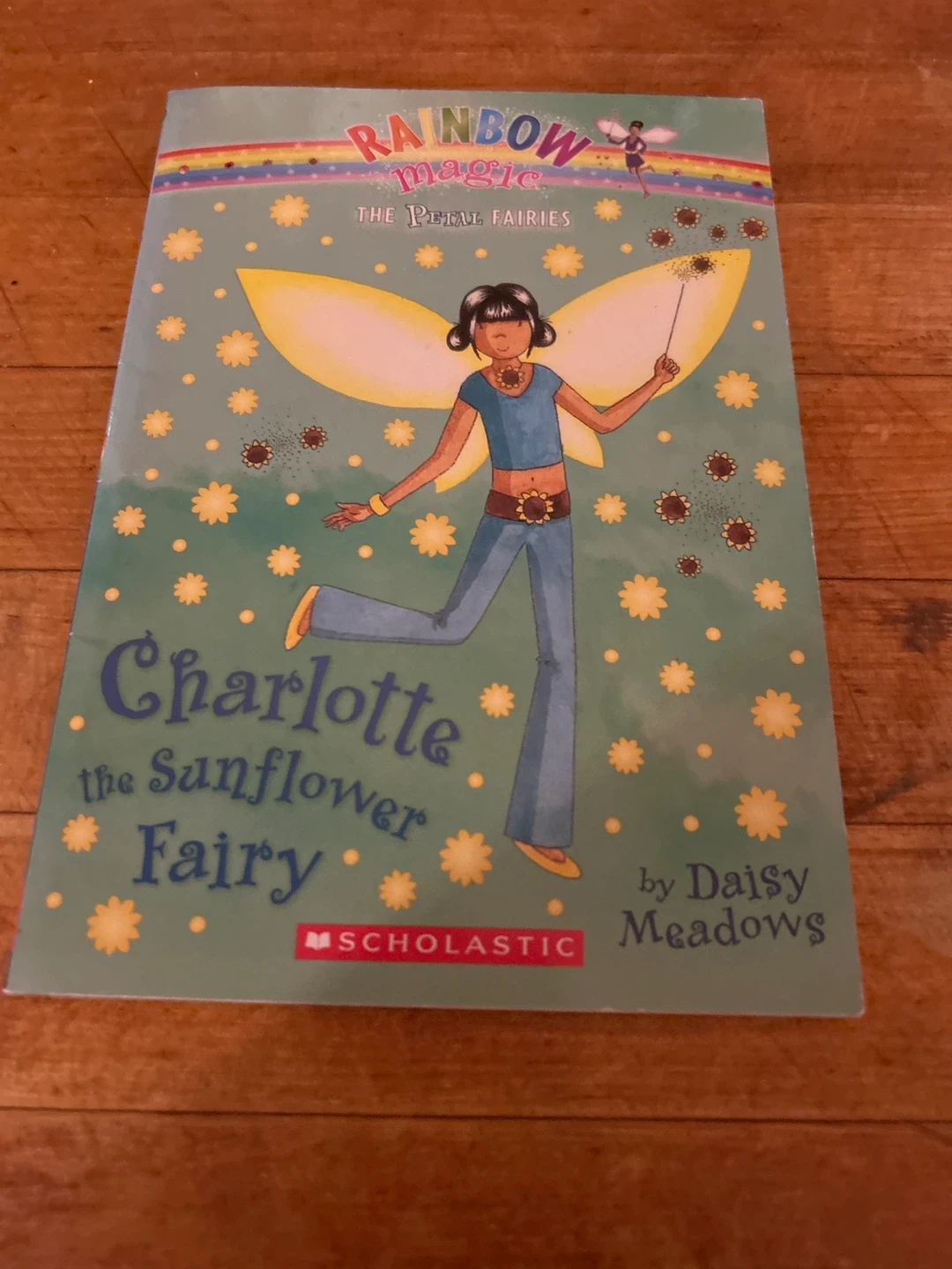 This is "Charlotte the Sunflower Fairy" from the Rainbow Magic series. It's part of "The Petal Fairies" collection and written by Daisy Meadows. Scholastic published this children's book.