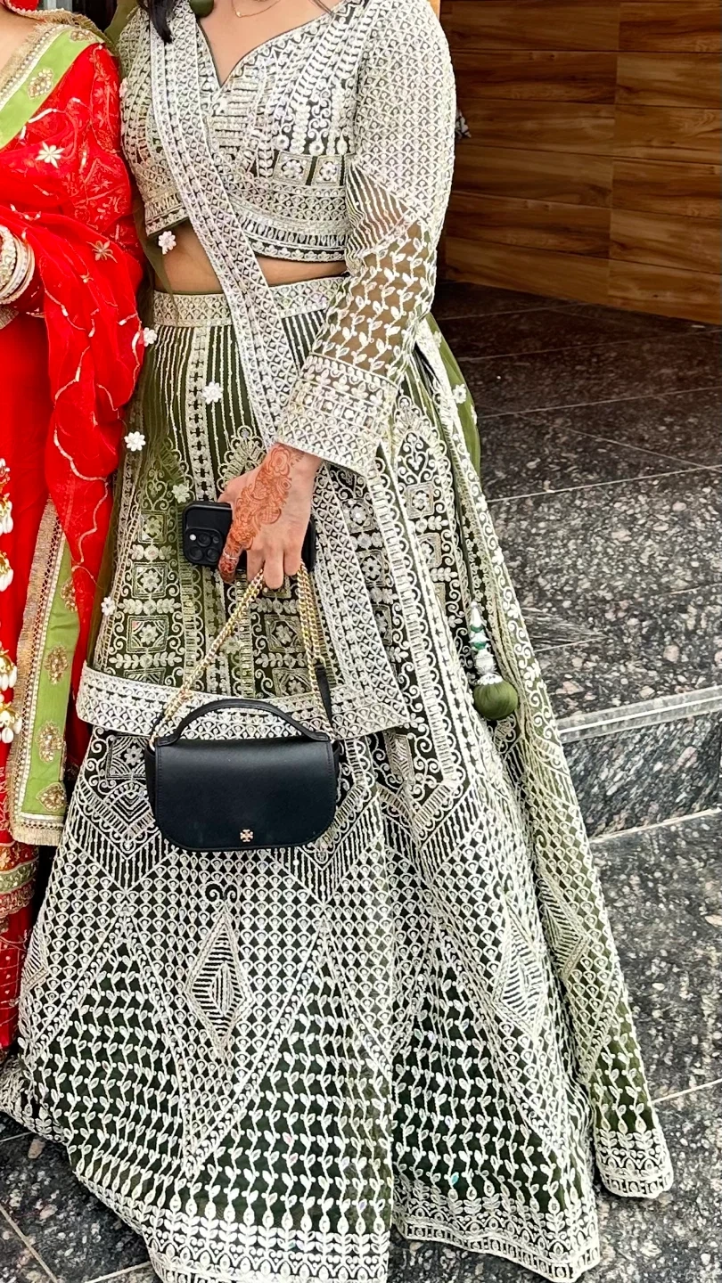 Beautifully embroidered lehenga choli set in an olive green hue. Features intricate white threadwork and embellishments throughout the skirt and blouse. This outfit is perfect for festive occasions. Used only once