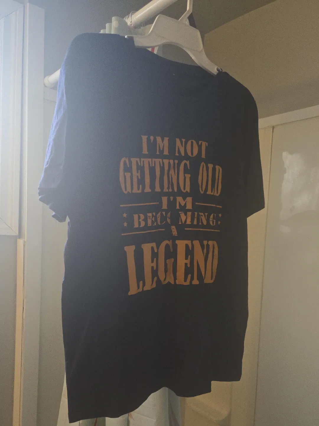 Navy blue t-shirt with "I'm Not Getting Old, I'm Becoming a Legend" printed on the back. Cotton material. Great for birthdays or anyone feeling legendary!