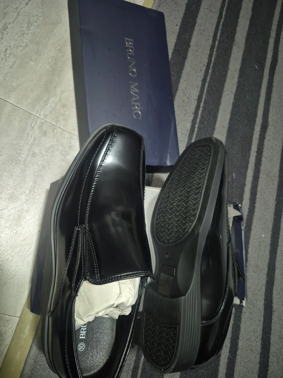 These Bruno Marc dress shoes are a classic black slip-on style. They feature a glossy finish and durable rubber sole. Size is 10. Ididn't used even once