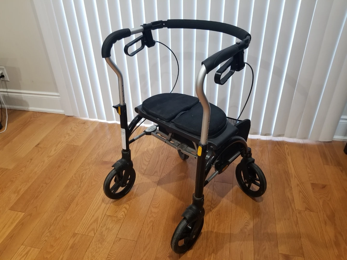 This rollator walker provides mobility support. It features a comfortable seat for resting. The handlebars are adjustable for personalized height. Foldable in good condition.