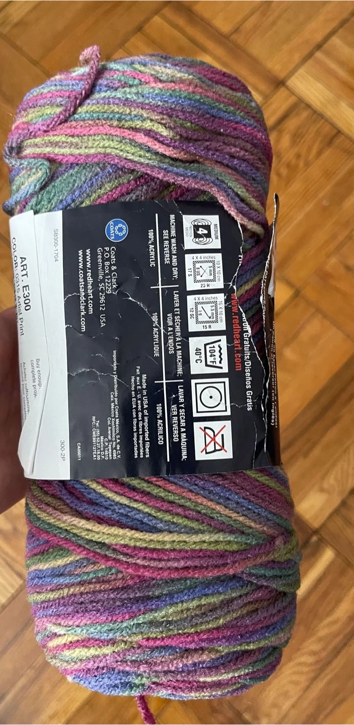 This is a skein of Red Heart Super Saver yarn in a multi-colourway. It's made from 100% acrylic. This yarn is 3.0 oz (141g) and has 243 yards (223 m).