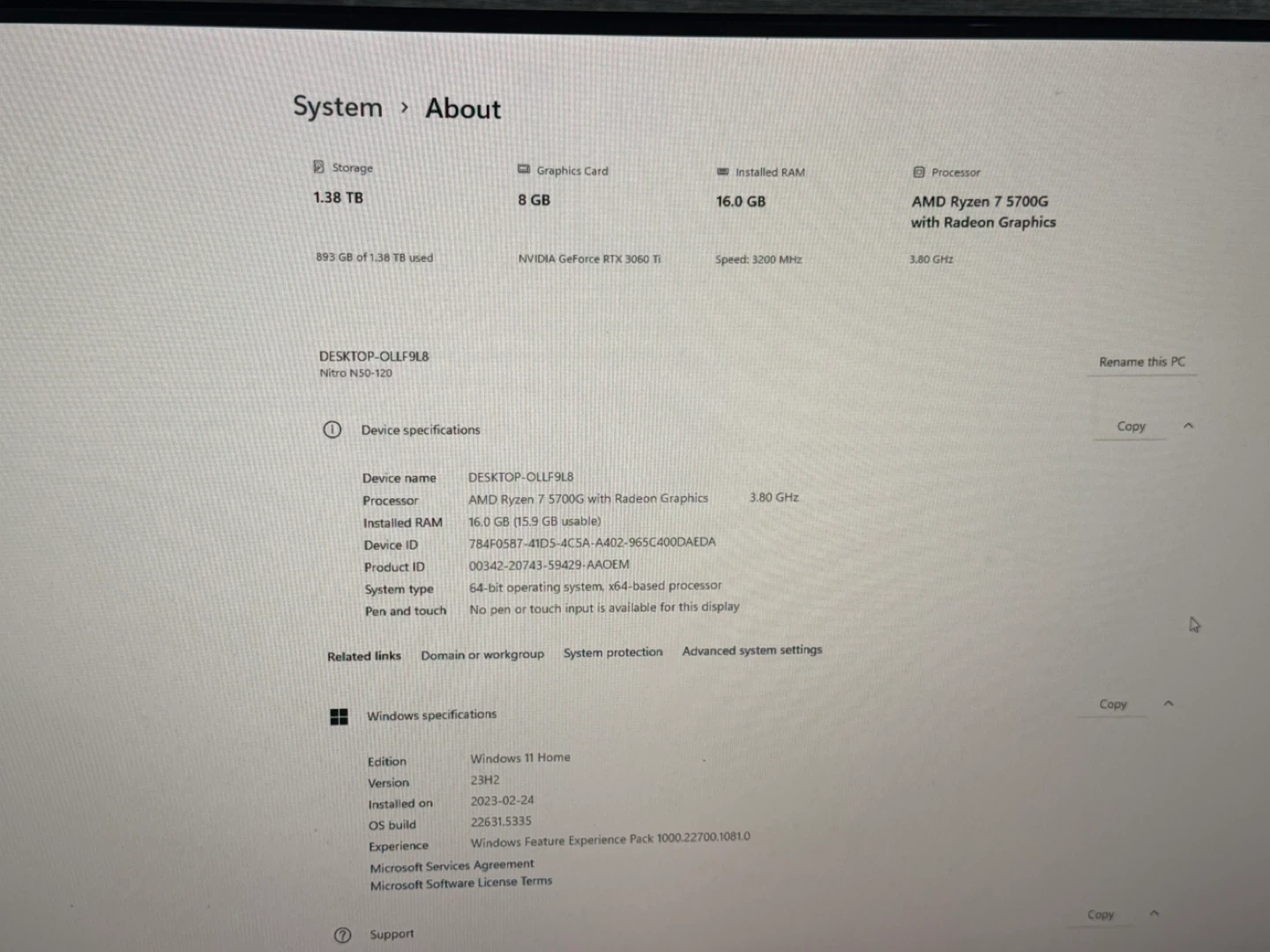 Acer Nitro N50-120 desktop computer. It's powered by an AMD Ryzen 7 5700G processor with Radeon Graphics. This PC has 16GB of RAM and a 1.38TB storage drive. It runs Windows 11 Home and has a NVIDIA GeForce RTX 3060 Ti graphics card.