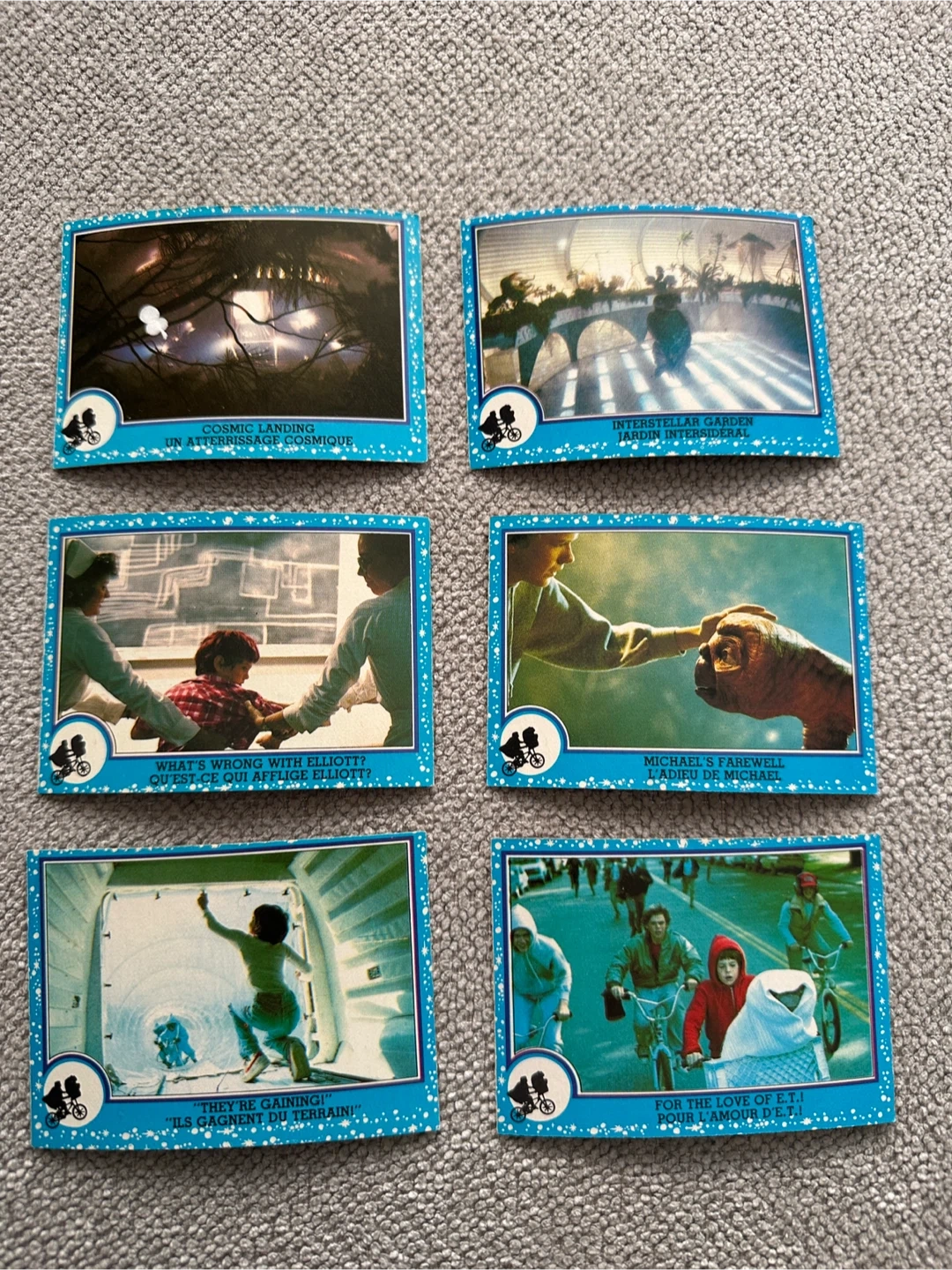 This lot includes six E.T. The Extra-Terrestrial trading cards, each featuring a scene from the classic film. They're great for any fan of the movie or collector of vintage memorabilia. Each card has English and French text.