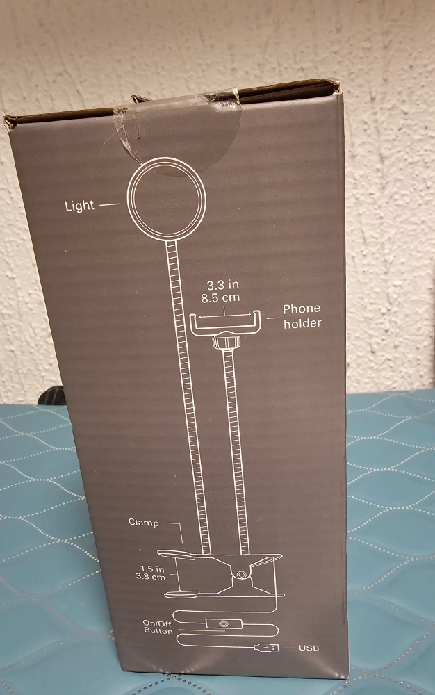 Phone holder and light. LED light with 3 brightness settings. USB powered. Fits most phones.