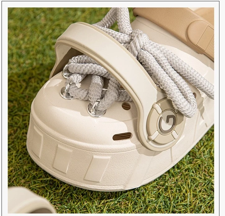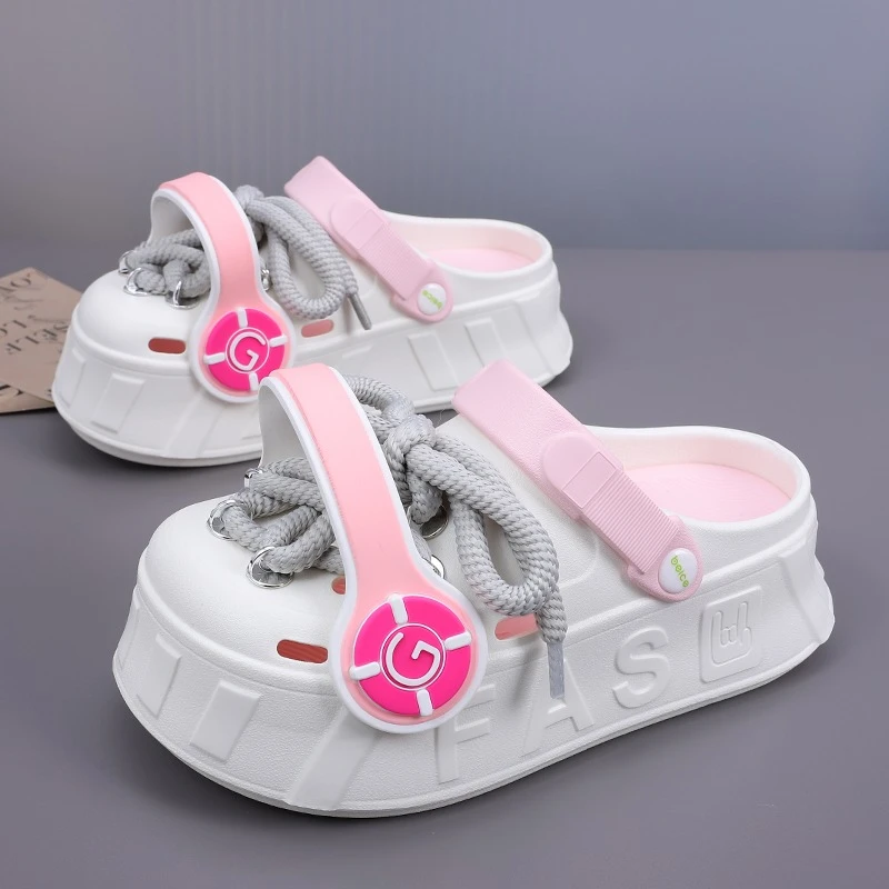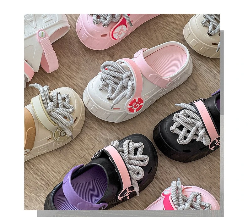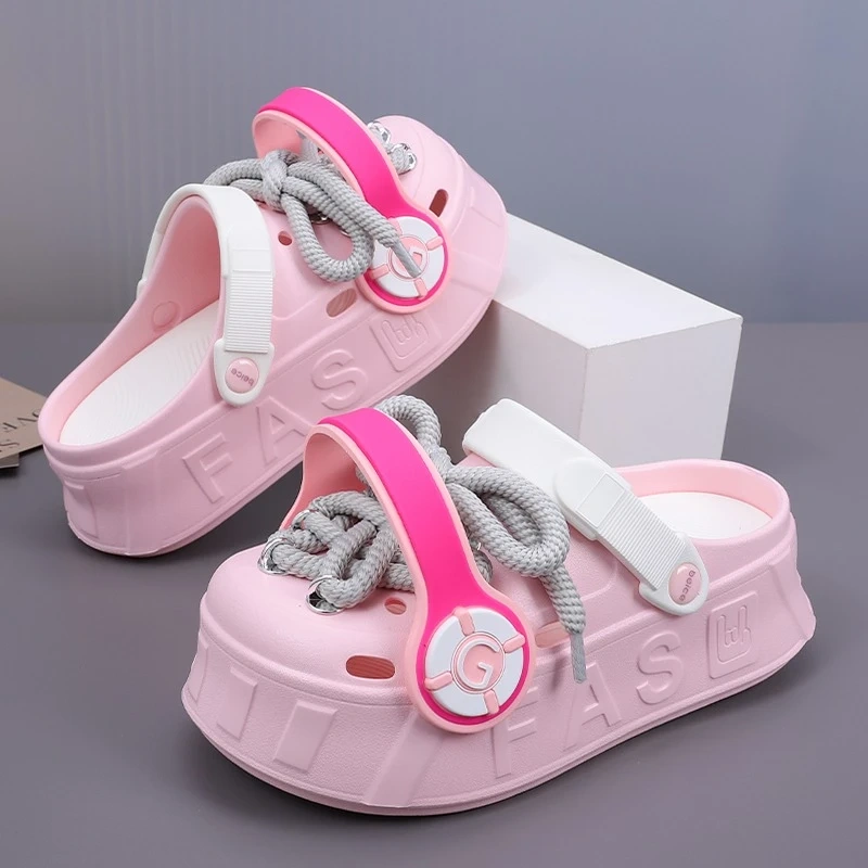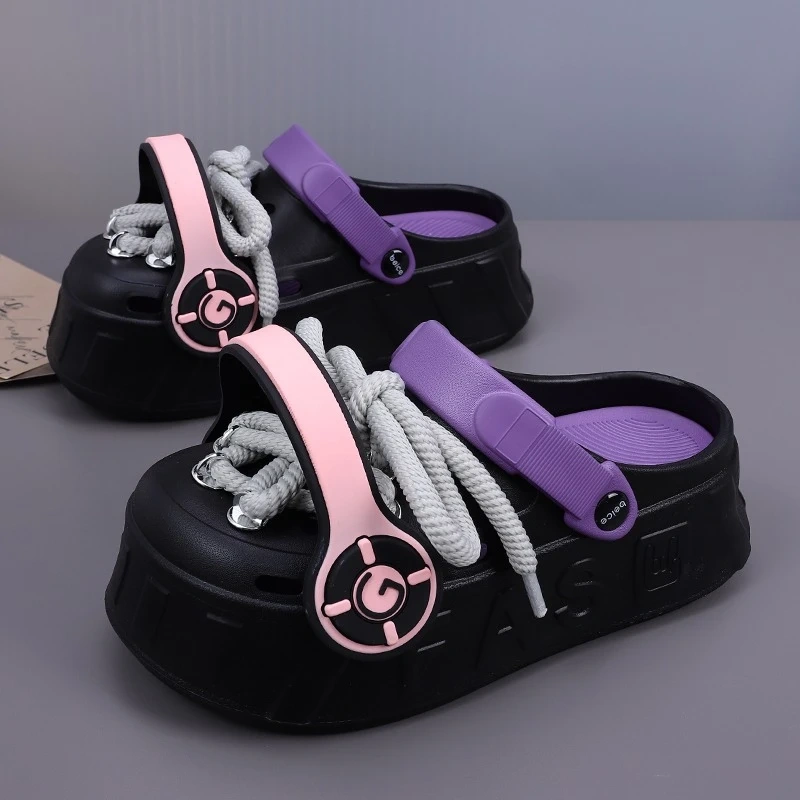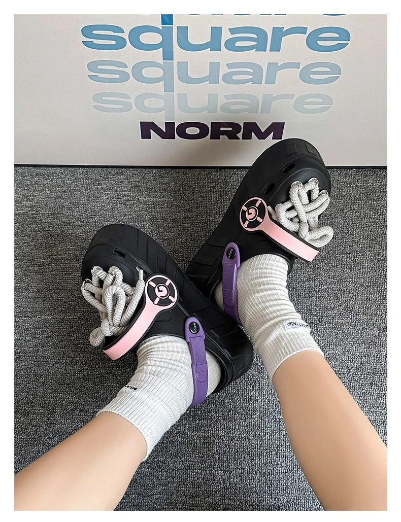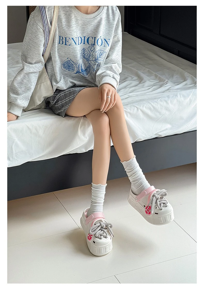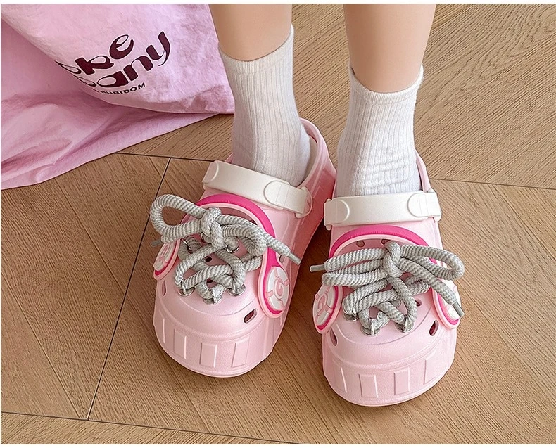 These platform clogs are super cute and comfy! They feature a unique design with decorative laces and a chunky sole. Perfect for adding a touch of fun to any outfit.
