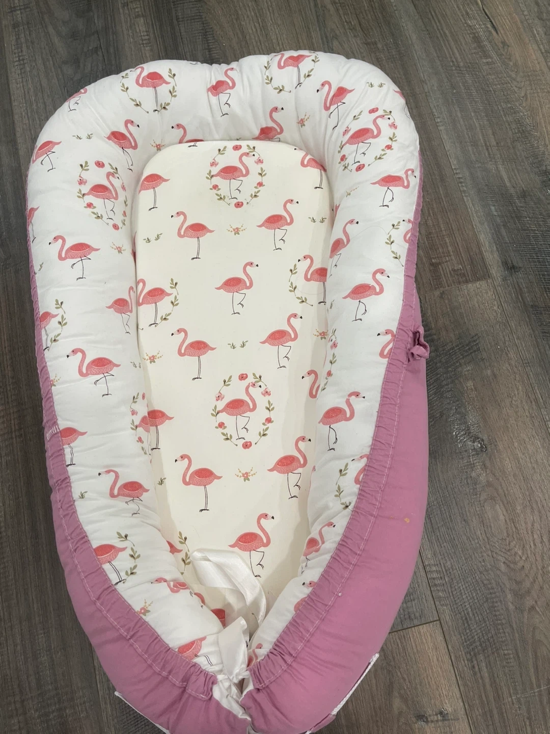 Soft baby lounger with a cute flamingo print. It's made with a comfortable cotton cover. This lounger's design is great for supervised naps and tummy time.