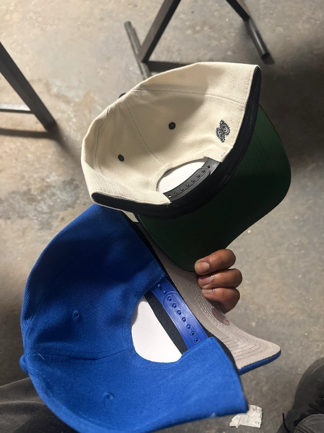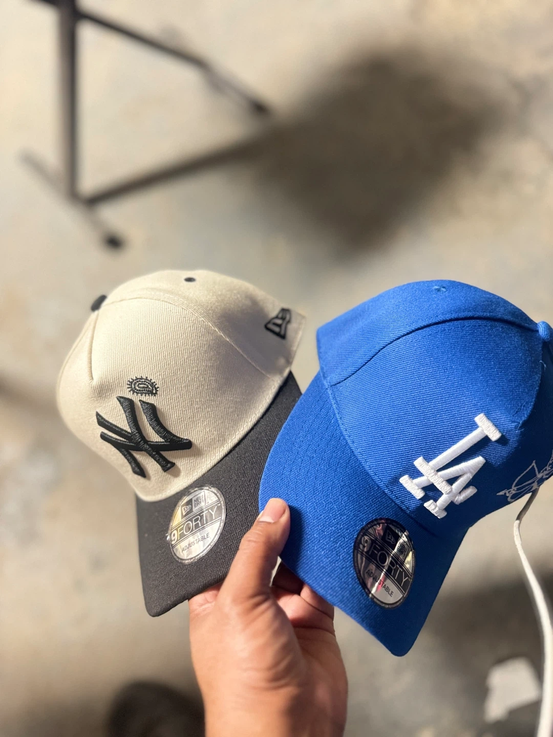 Three New Era 9FORTY adjustable baseball caps are included. Two caps feature New York Yankees and Los Angeles Dodgers logos. One cap is beige, one is blue, and one is black. They're adjustable for a comfortable fit.