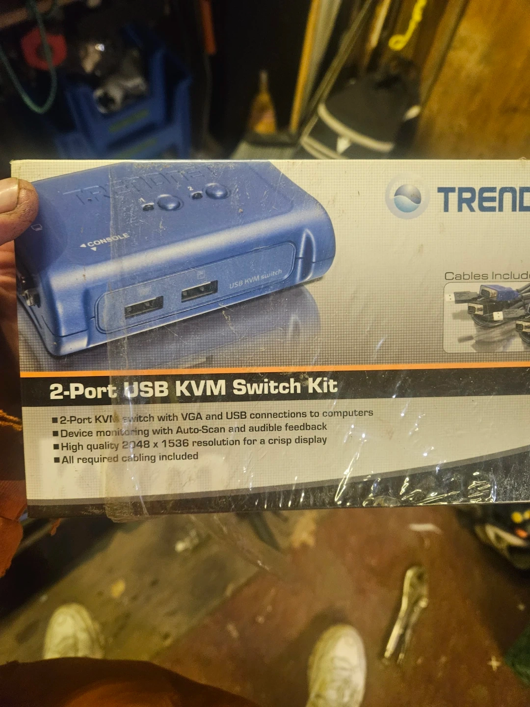 This is a TRENDnet 2-Port USB KVM Switch Kit, model TK-207K. It supports 2-Port KVM with VGA and USB connections to computers. Device monitoring with Auto-Scan and audible feedback is included, offering high quality 2048 x 1536 resolution for a crisp display. All required cabling is included.