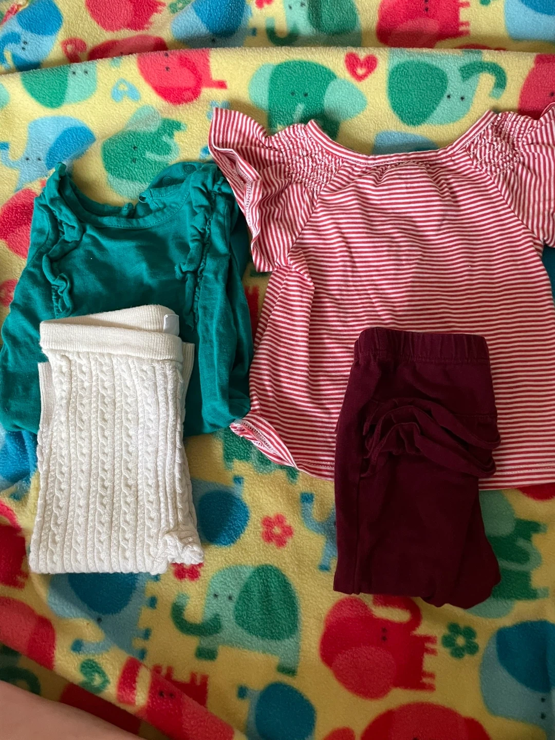 20A sweet little bundle of baby clothes! Includes two cute shirts and two pairs of leggings. Perfect for a growing little one!