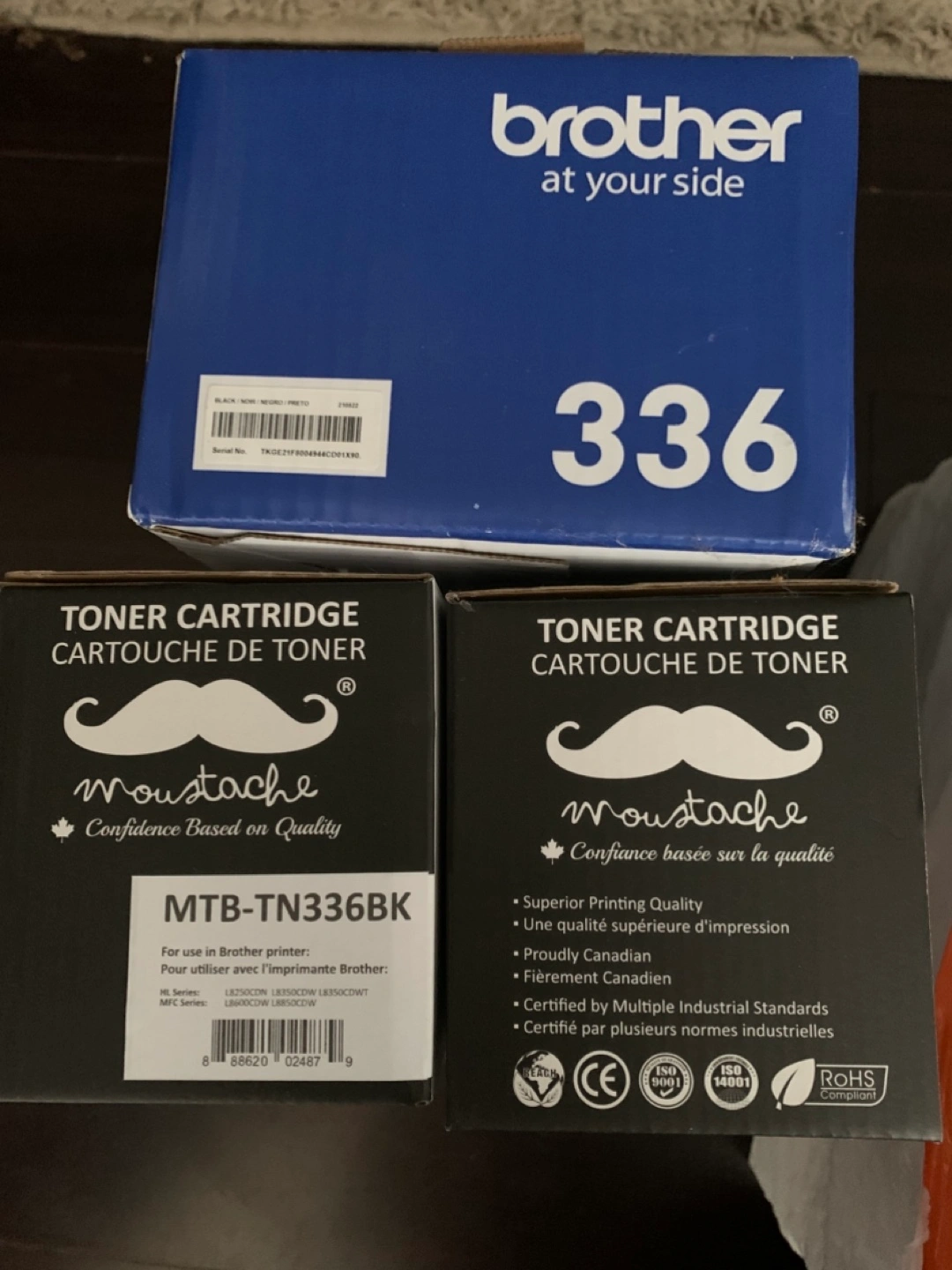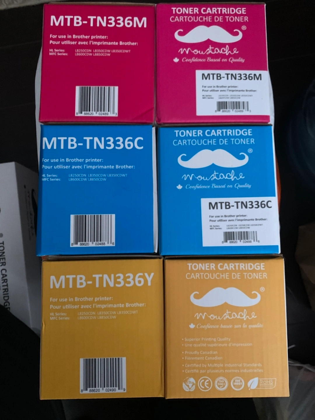 91Six Moustache brand compatible toner cartridges for Brother printers. Includes one black, one cyan, one magenta, one yellow, and two black cartridges. Compatible with various Brother printer models.