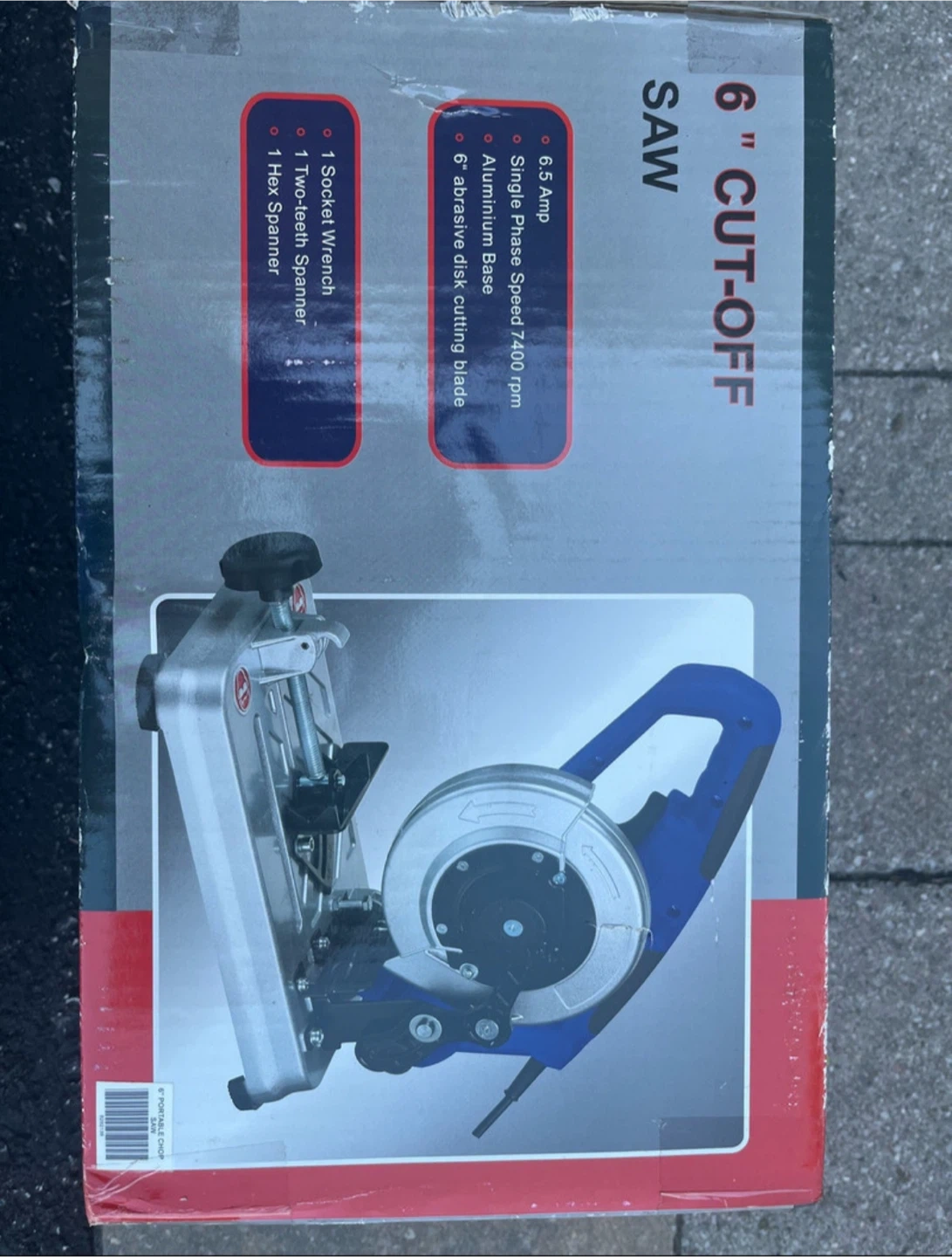 Selling a 6" cut-off saw! It has a 6.5 Amp motor and a single-phase speed of 7400 rpm. It comes with an aluminum base and a 6" abrasive disk cutting blade. Also included are a socket wrench, a two-teeth spanner, and a hex spanner