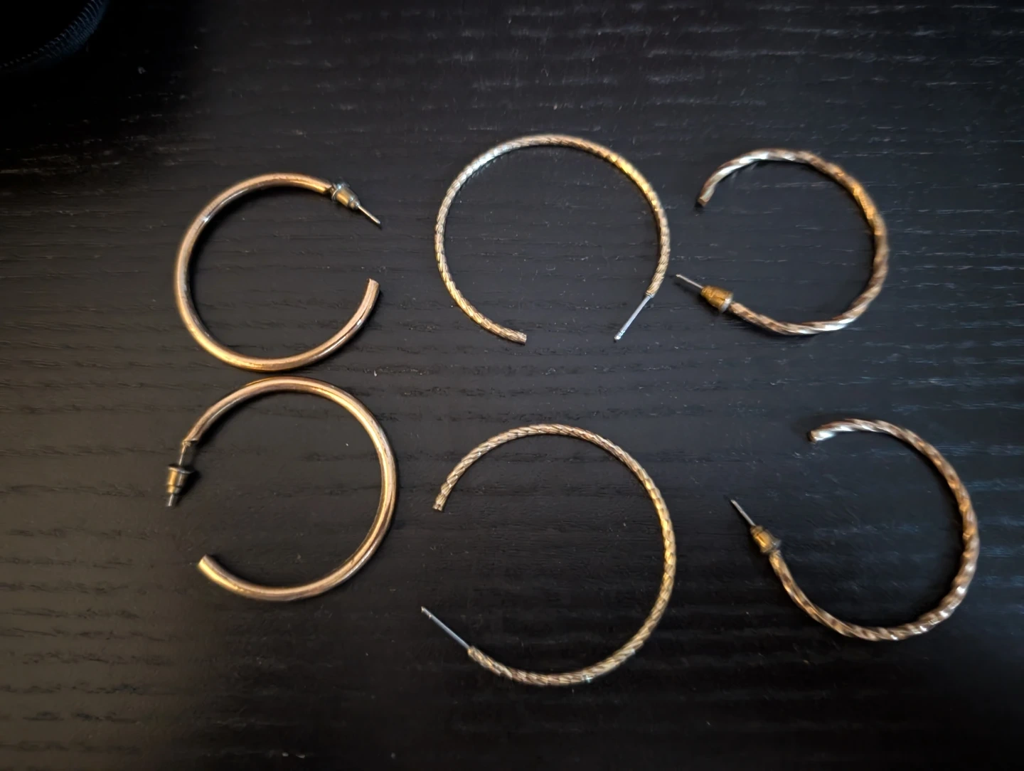 449Selling a set of six gold-tone hoop earrings. Three are plain and three have a textured design. They need a clean as they've been in my drawer for a while. *Cash only