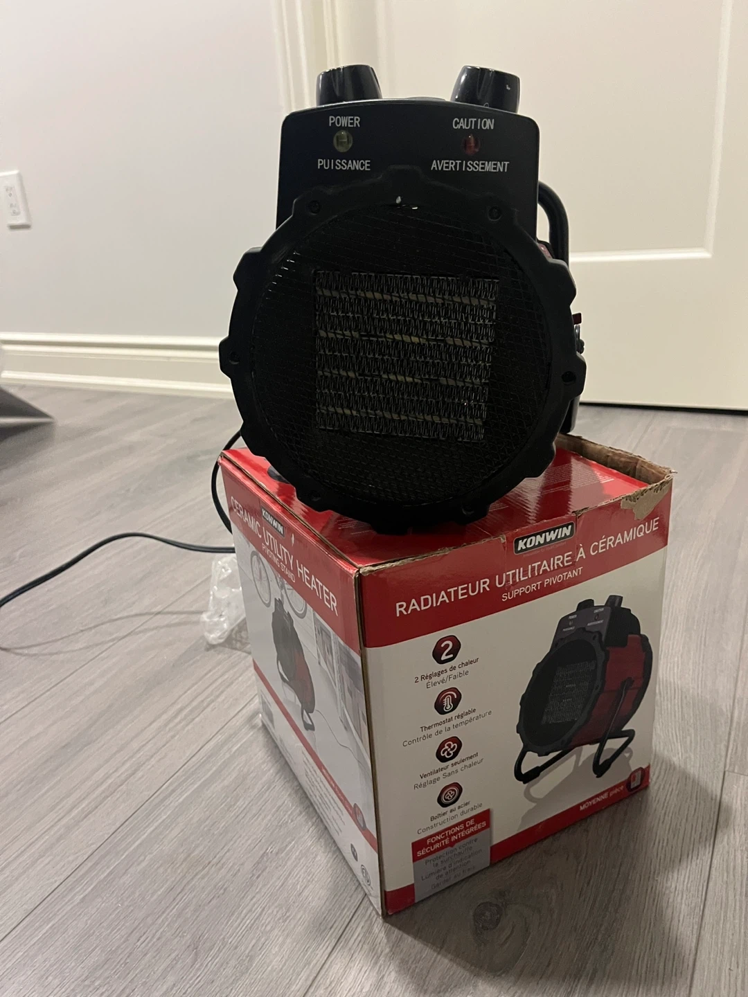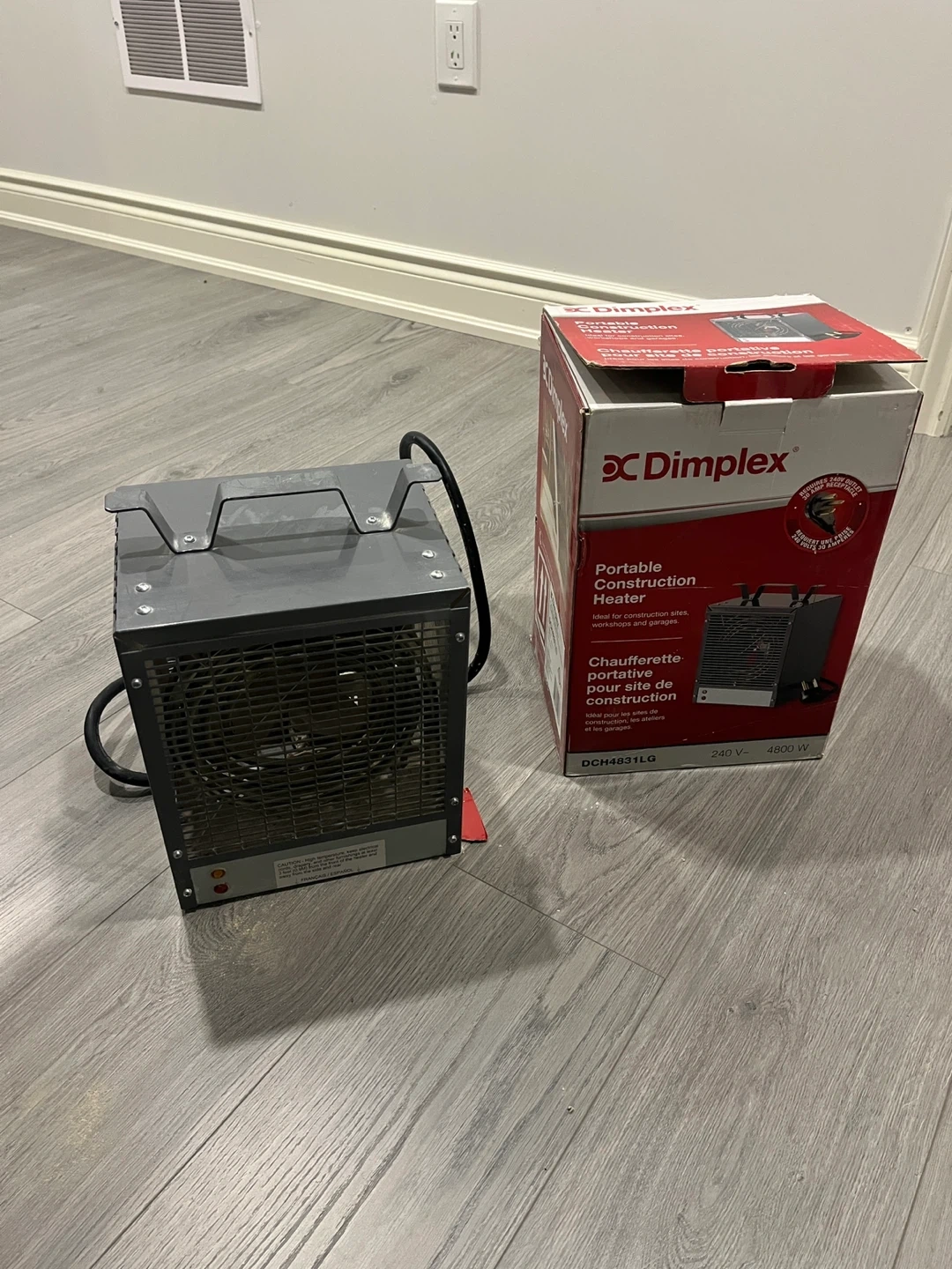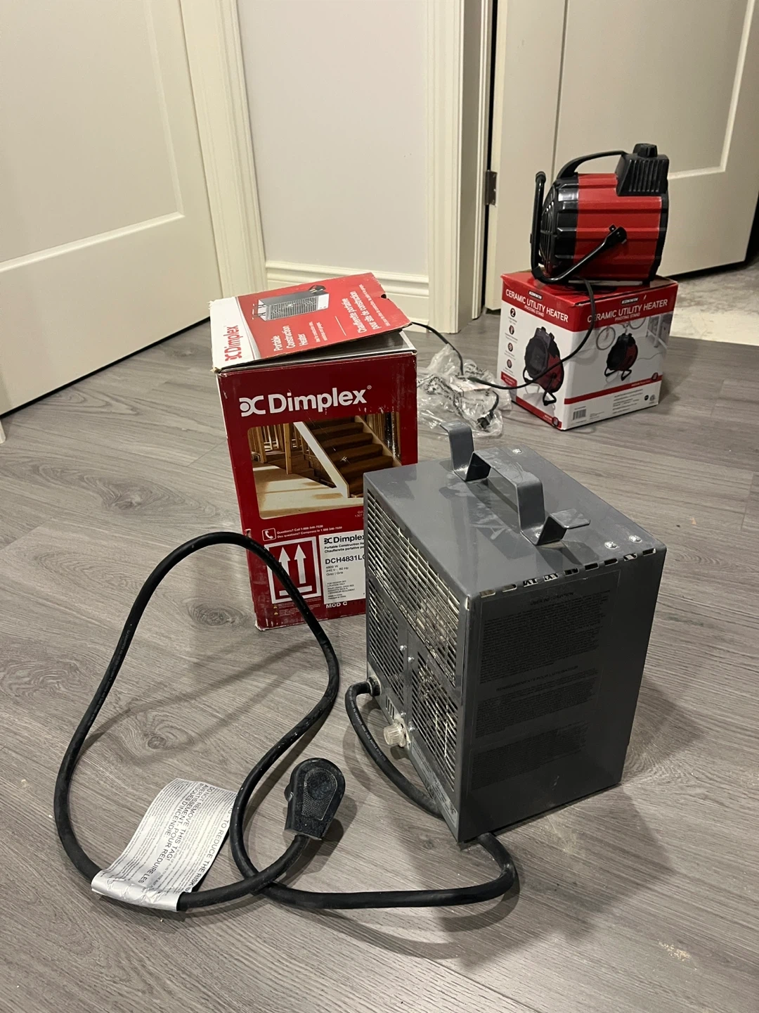Selling 6 portable heaters. 2 Dimplex Portable Construction Heater DCH4831LG, and 4 Konwin Ceramic Utility Heaters with pivoting stands. All come with their original boxes.