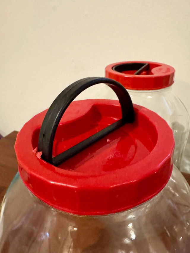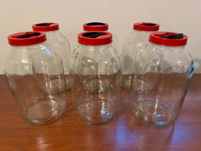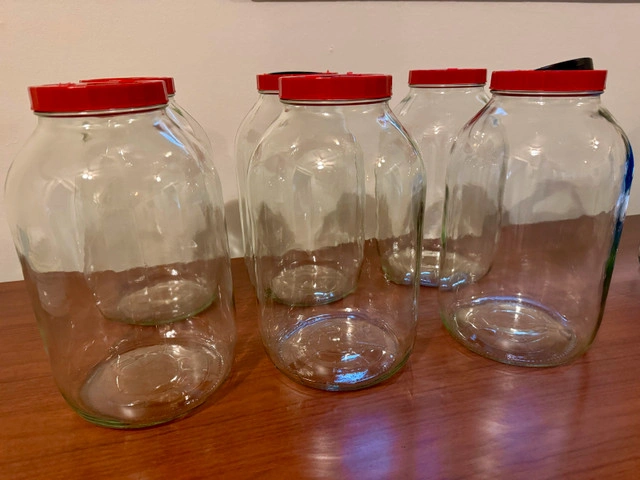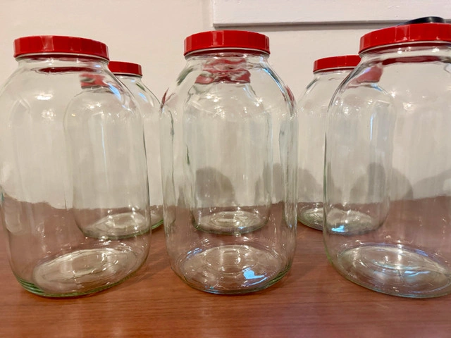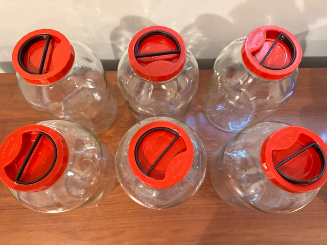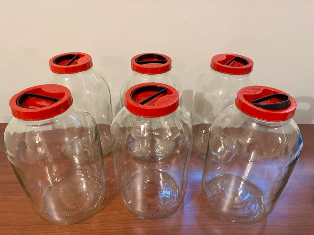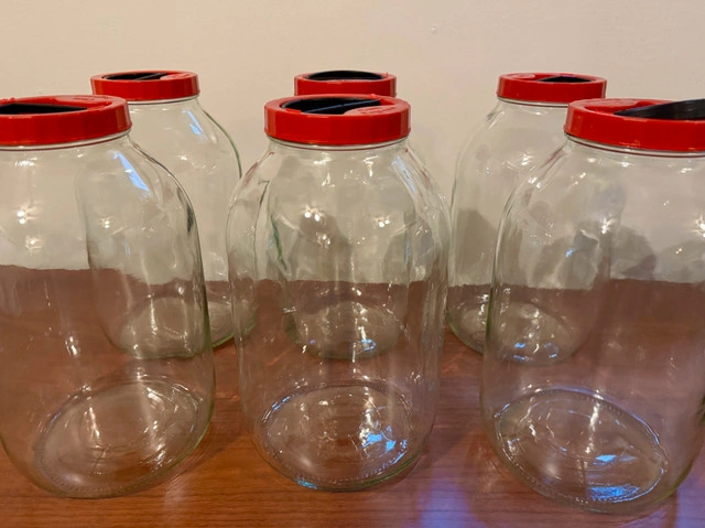 27Set of 6 large 5-litre glass jars, each with a tight-sealing red screw-on lid. Perfect for pickling, fermenting, or storing dry goods like pasta, rice, or flour. All are clean and in excellent condition. Selling as a set. Price: $80 for all (or $15 each) Check my other listings for more.