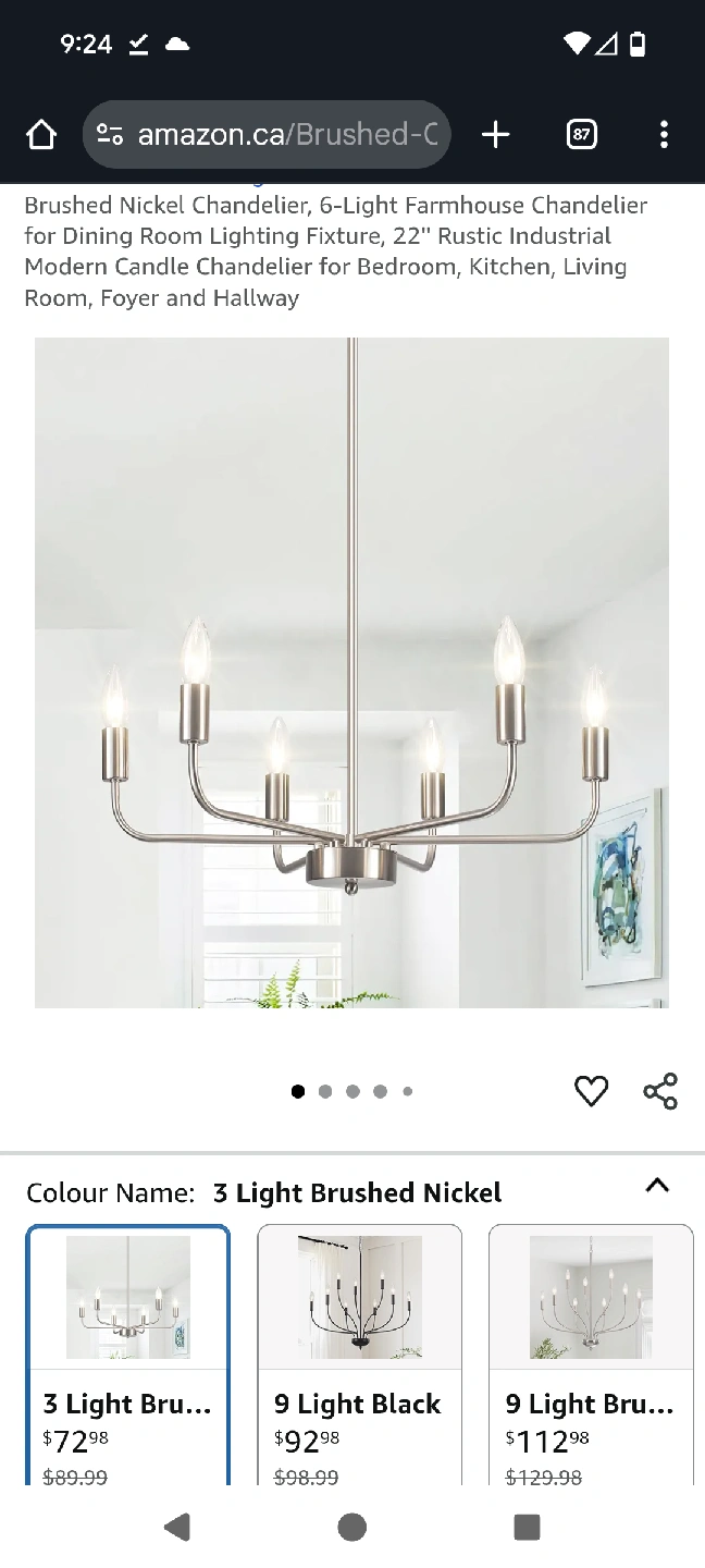 Selling a 6-light farmhouse chandelier with a brushed nickel finish. This modern candle chandelier is perfect for dining rooms, living rooms, bedrooms, kitchens, foyers, and hallways. It measures 56 x 27 x 22 cm. The box is included