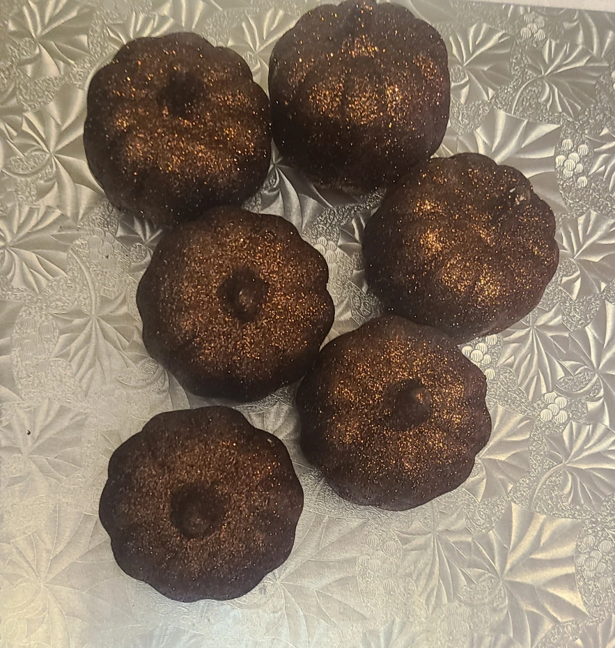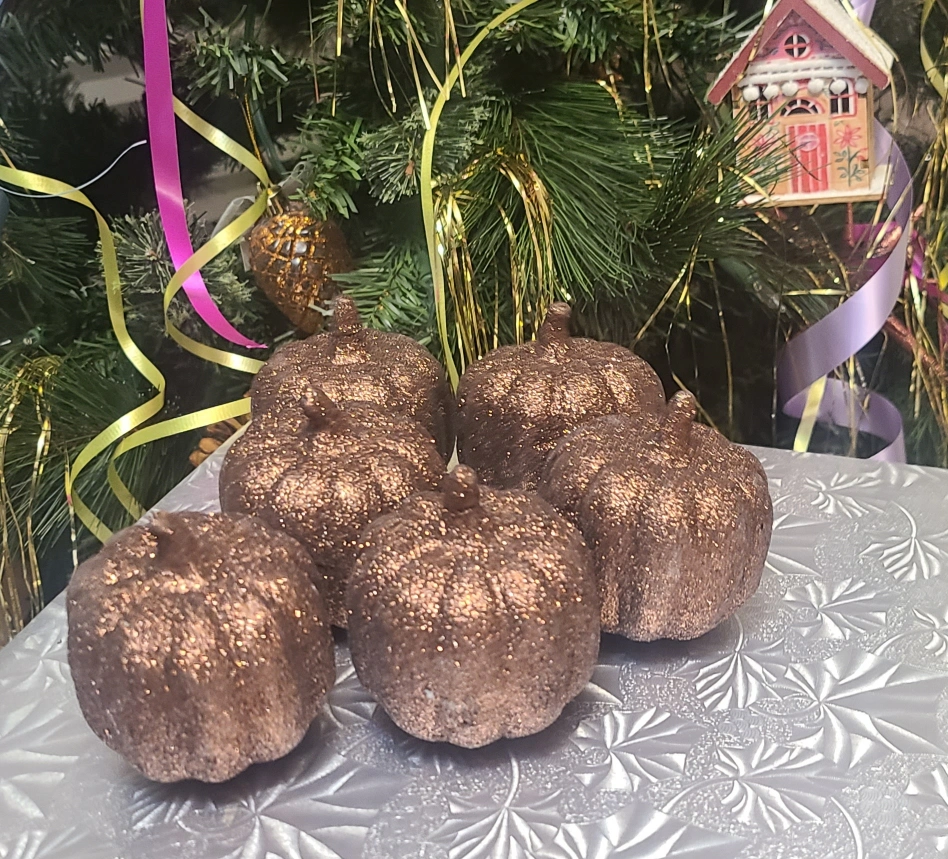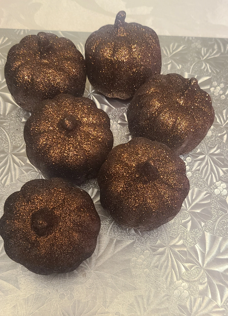 Set of six bronze glitter pumpkins. Perfect for fall decorating. Small size, ideal for tabletops or mantles. Sold in original packaging. original price is 9$ Sale for 5$ harbour landing pick up.