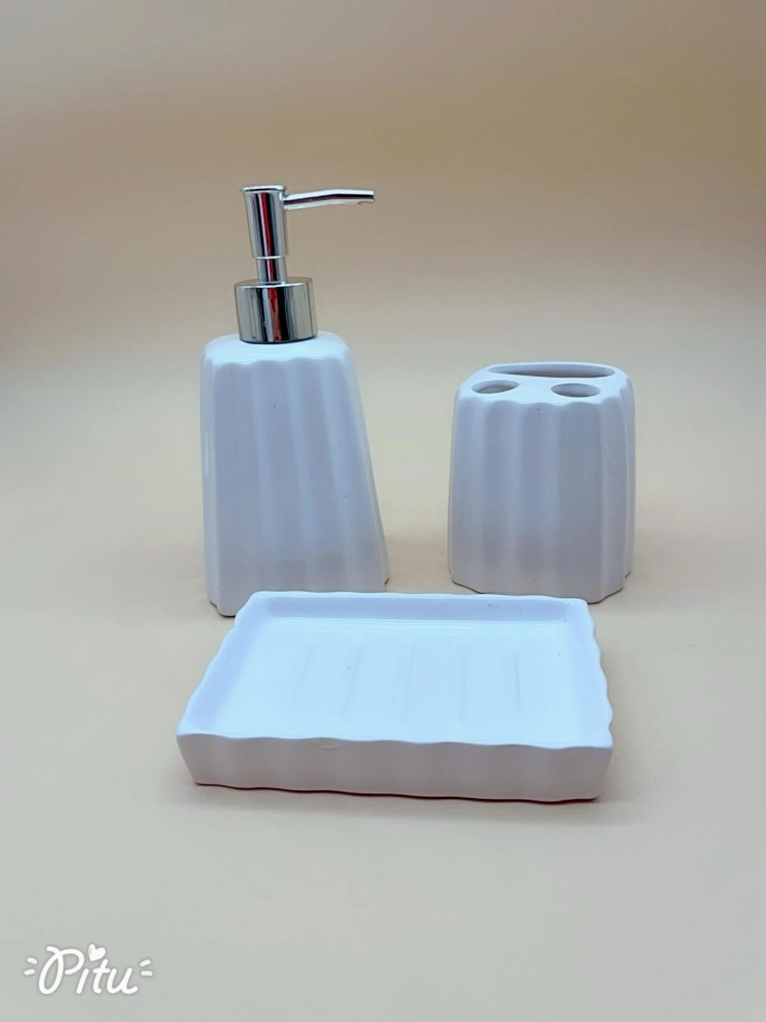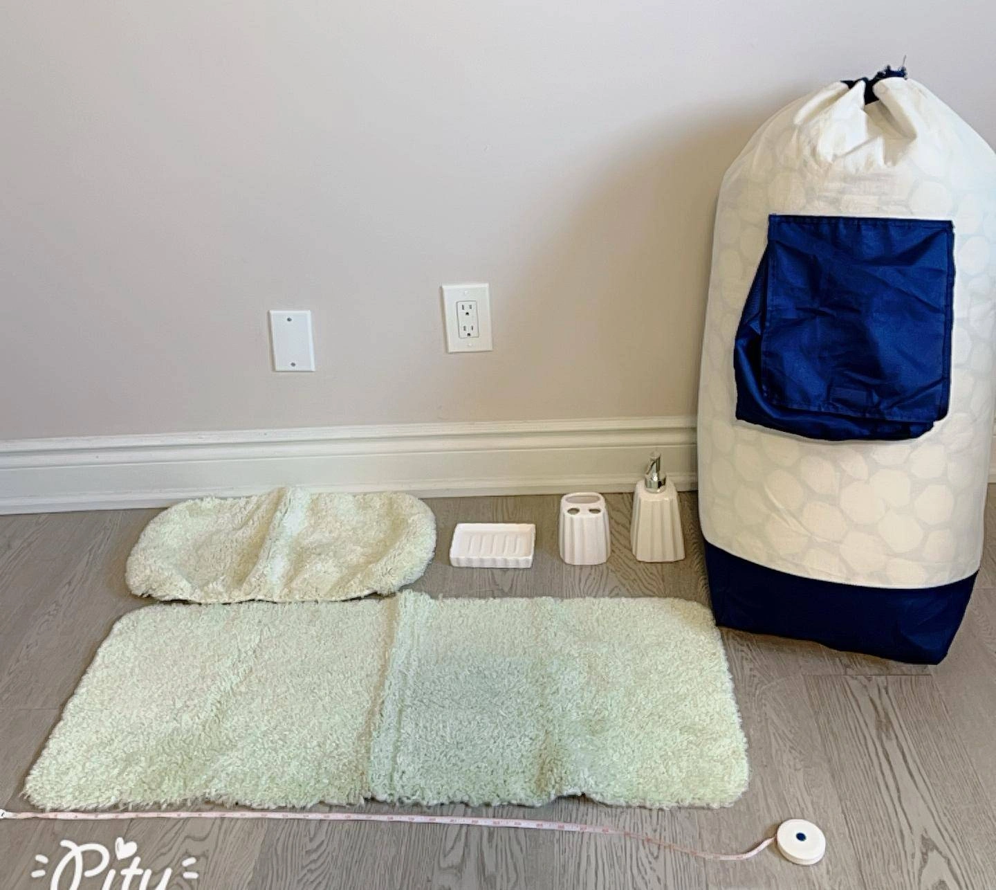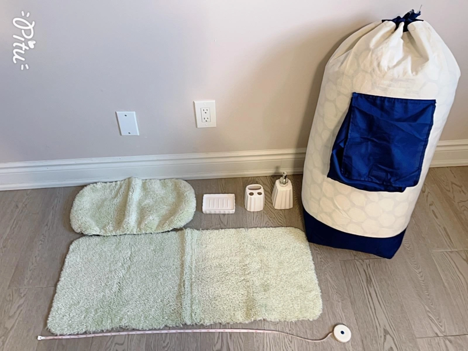 546-piece bathroom ensemble in a soft, neutral palette—It includes Large white and navy blue canvas laundry bag with a front pocket, placed on a light wood floor against a blue wall. Next to it are three white bathroom accessories: a toothbrush holder, a soap dispenser, and a soap dish. Simple, clean, and practical setup! 🧺🛁 The wire frame is a bit loose and needs a little fixing to tighten it up yourself, a matching absorbent bath mat & , all neatly arranged for everyday pampering. Super cozy and elegant for any bathroom refresh! 🛁 1.laundry bag 2.toothbrush holder 3. soap dispenser 4. soap dish 5. bath mat 15" x 36" 6. tank lid cover