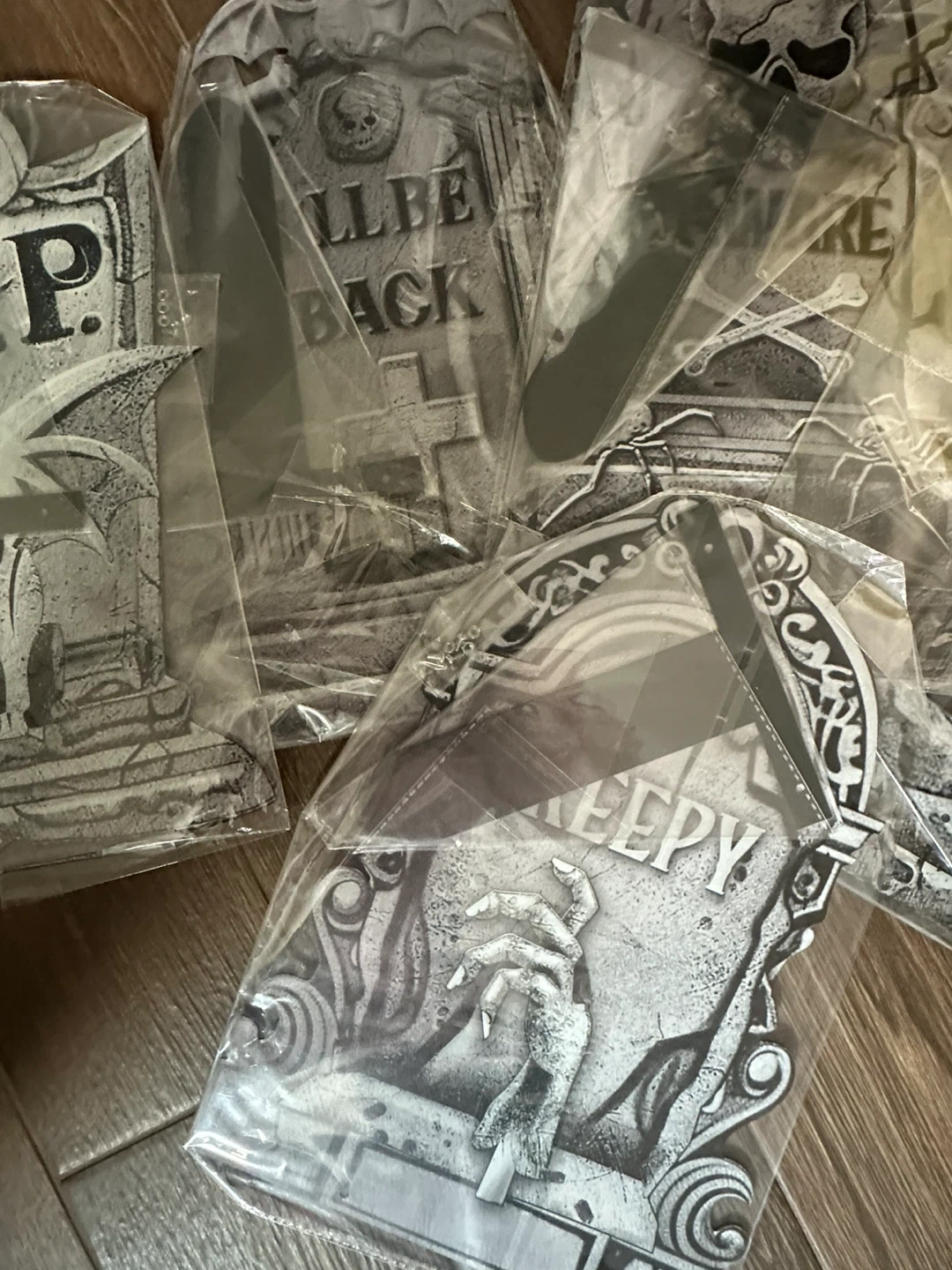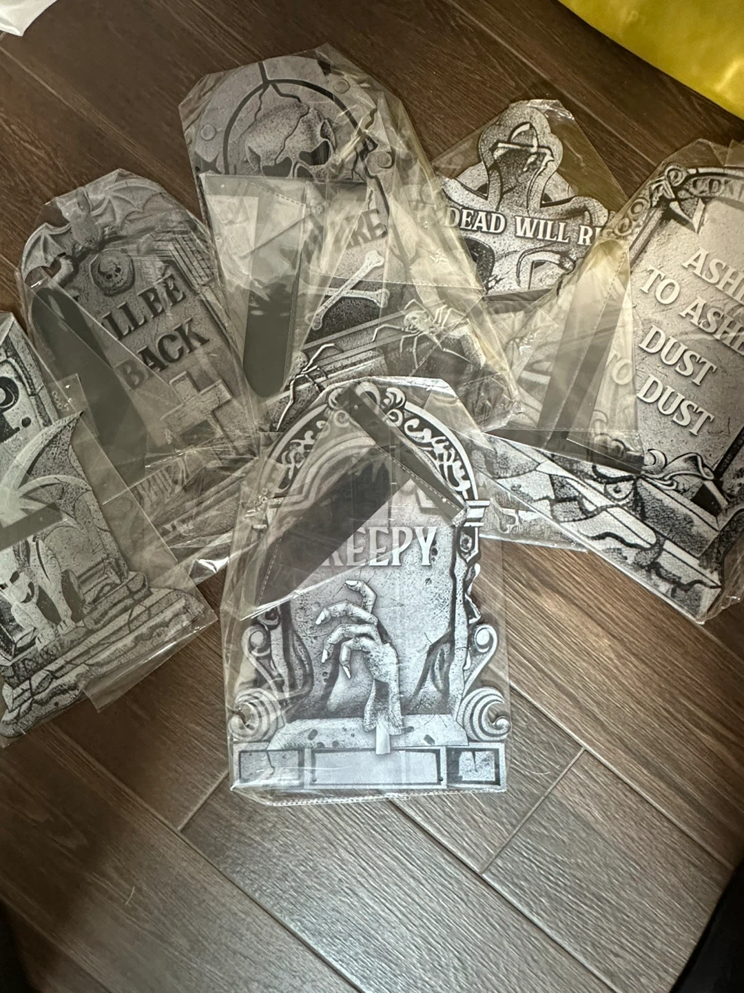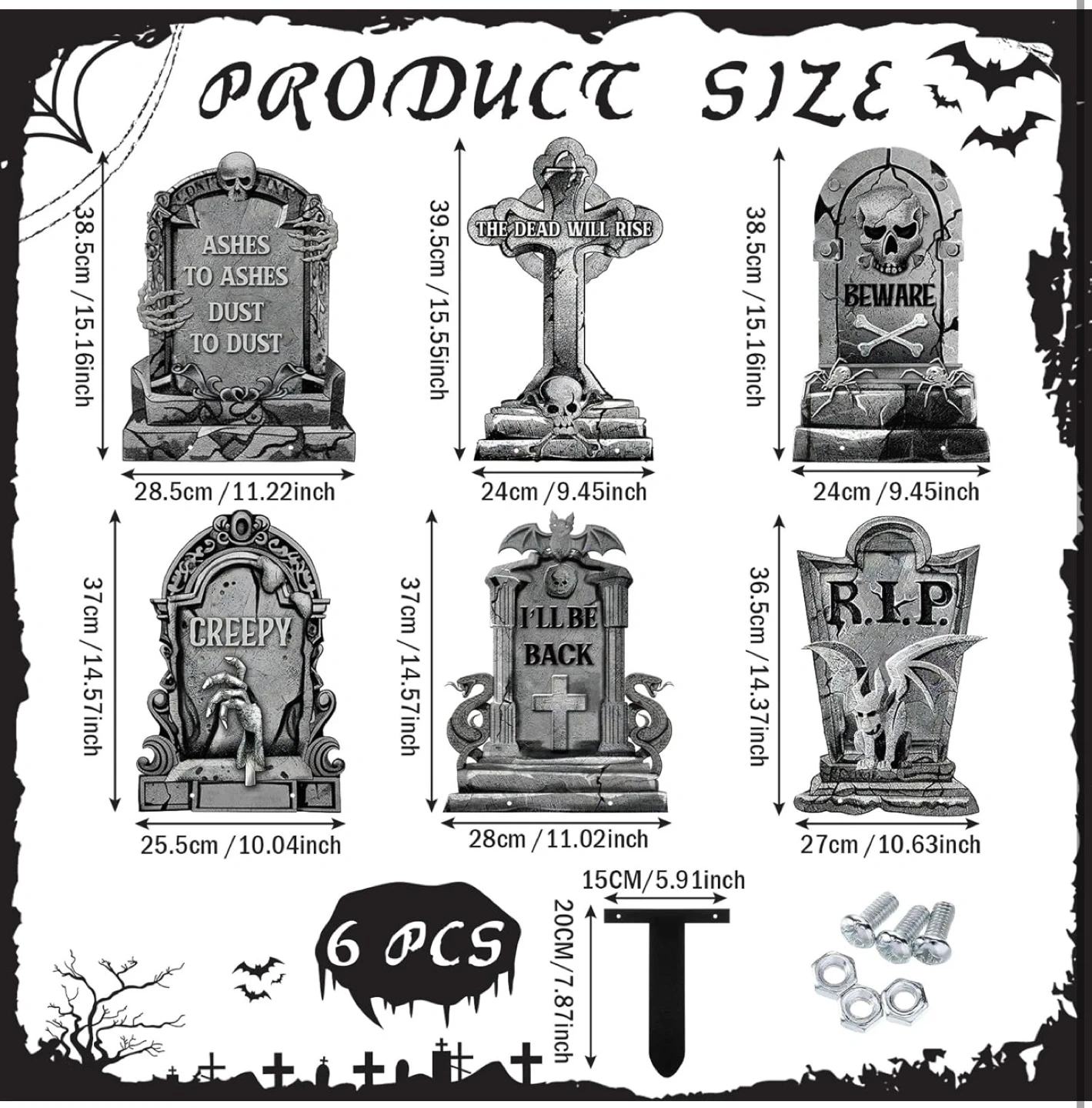 Get ready for Halloween with this set of 6 tombstone decorations! They're brand new and still in their original packaging. Each tombstone has a unique design, including 'Ashes to Ashes, Dust to Dust,' 'The Dead Will Rise,' and more. Perfect for adding a spooky touch to your yard or home this Halloween!