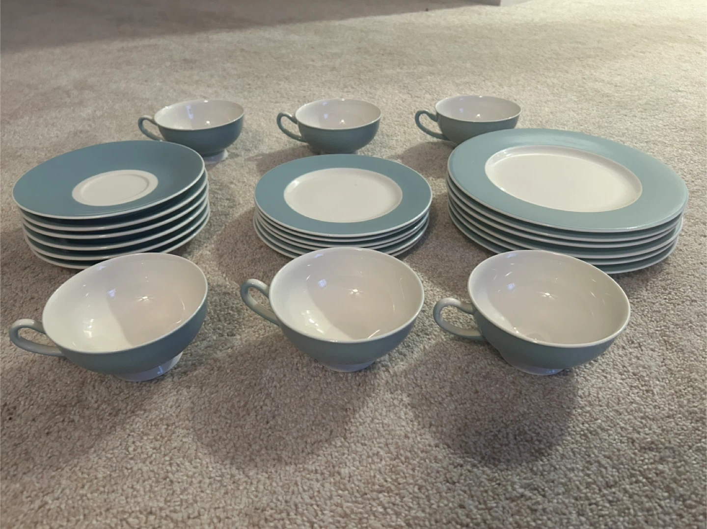 106 Light blue color tea cups with 3 different sizes of plates 6 each Total of 18 plates you can use it as snack plates