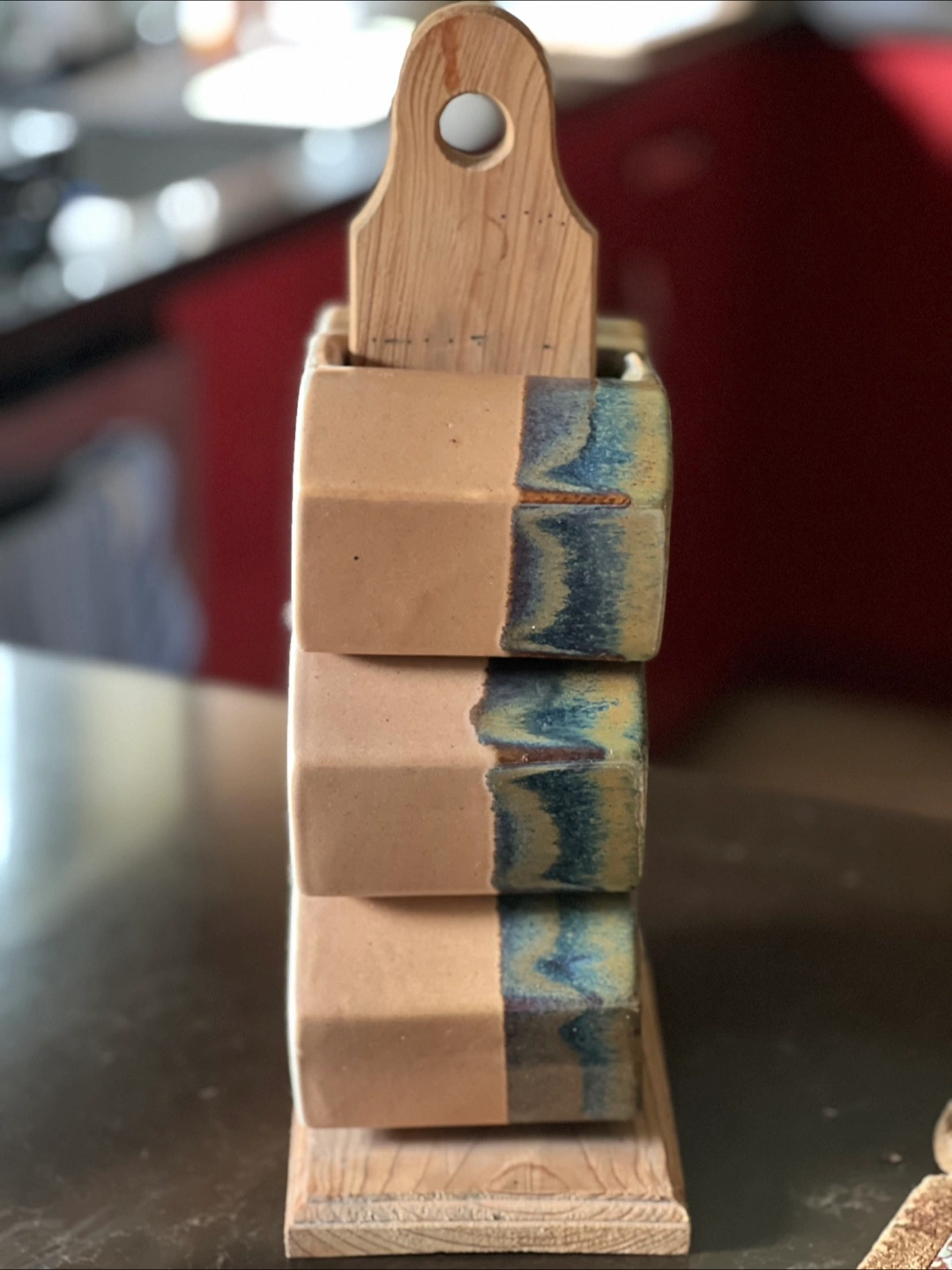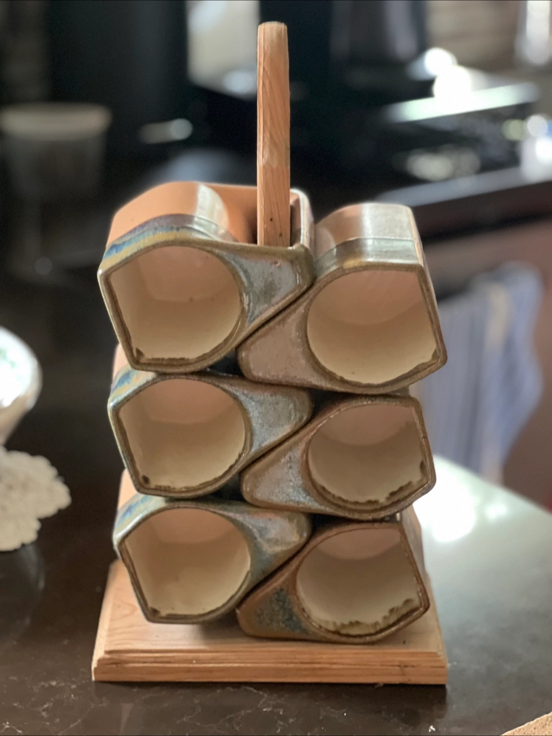 Unique Potilla pottery mug stand in excellent condition! This handcrafted piece adds a touch of rustic charm to any home. Holds six mugs.