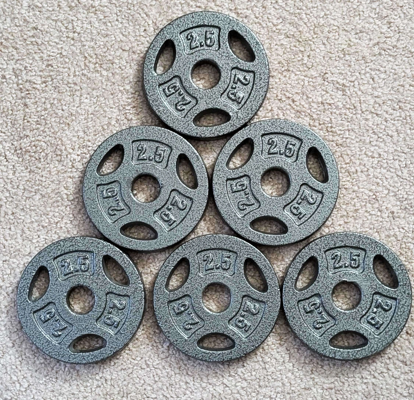 116If you are seeing this Ad, then this item is still available This sale is for 6 like new, 2.5lb Steel Weight Plates - 1 inch Standard Hole These weights are ideal for progressive overload in strength training or fine-tuning resistance for rehab or beginner routines. Specifications: • Solid cast steel or iron with a textured metallic finish, likely powder-coated or hammertone for durability and corrosion resistance. • 1 inch, compatible with standard barbells and curl bars. • The tri-grip design adds safety and convenience, especially for quick swaps during supersets or circuit training. Pick-up in Pickering ONLY This item comes from a smoke-free home.