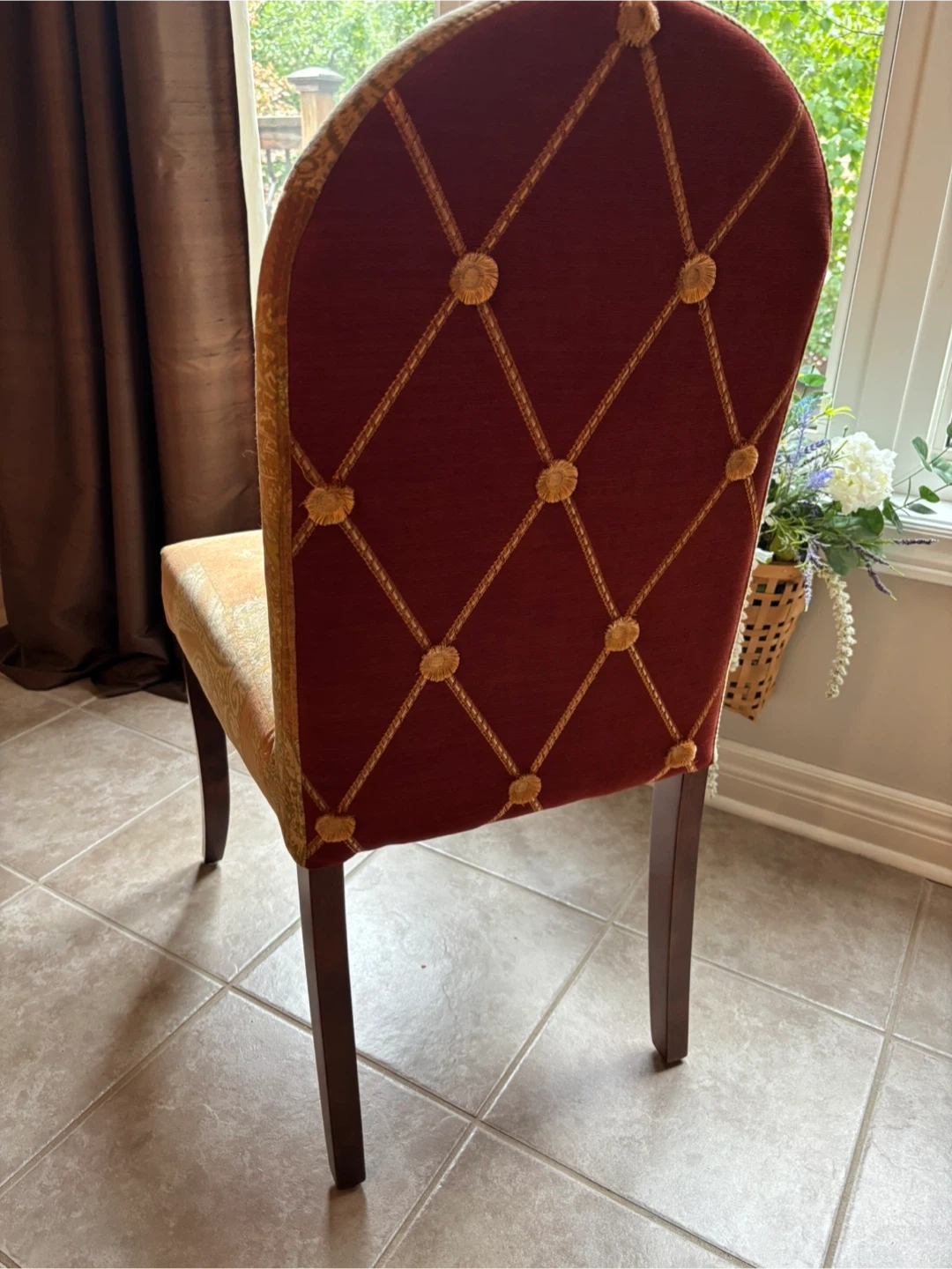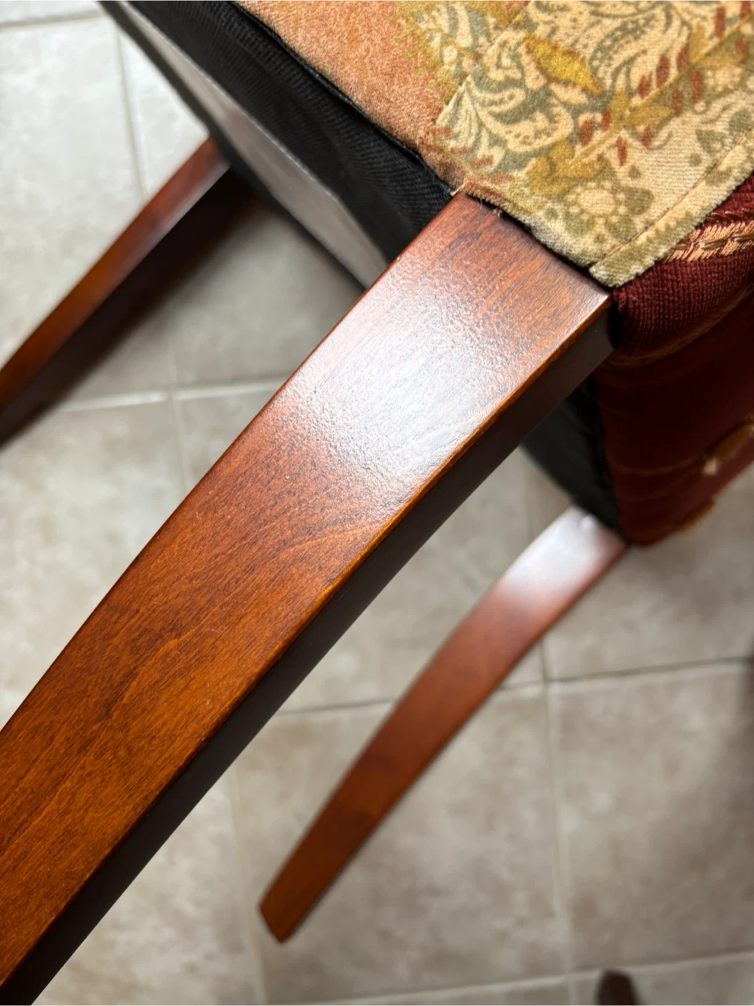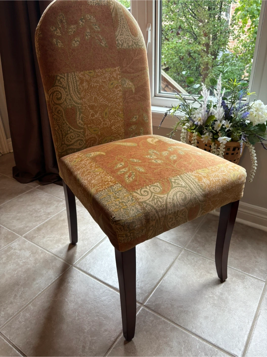 Selling 6 X lovely upholstered dining chairs! It features a unique floral pattern in shades of orange, yellow, and brown. The chair has a sturdy wooden frame with a dark finish, and the upholstery is in good condition. Perfect for adding a touch of elegance to your dining room or kitchen!