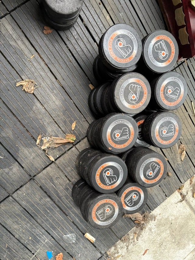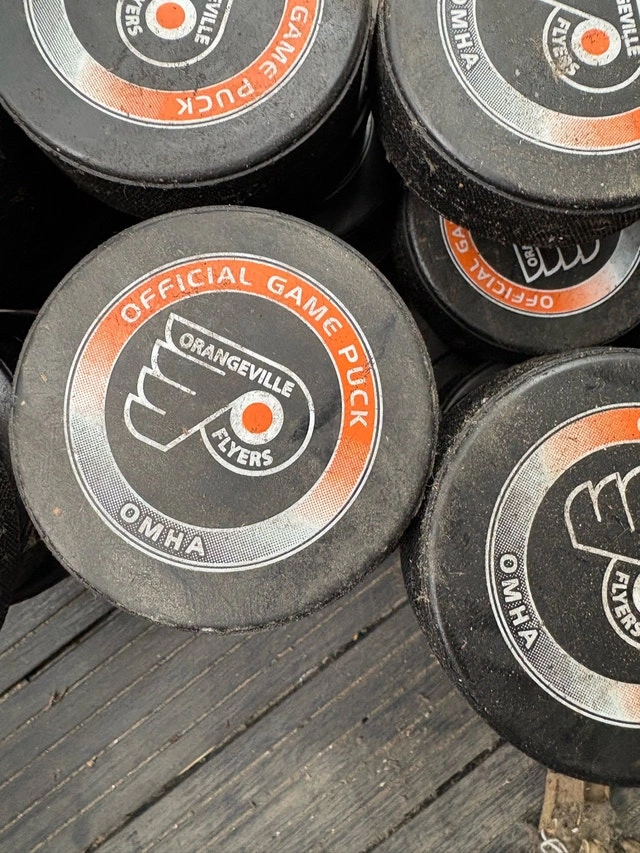 134You're viewing a lot of 60 hockey pucks, appearing in like-new condition, perfect for practice, training, or stocking up for your local league! These pucks look barely used and are ready to hit the ice once more. * Standard size and weight * Official game pucks 50 of them are basically brand new and have the Orangeville Flyers logo on them. Originally purchased for 4$ each. For Sale By: Owner
