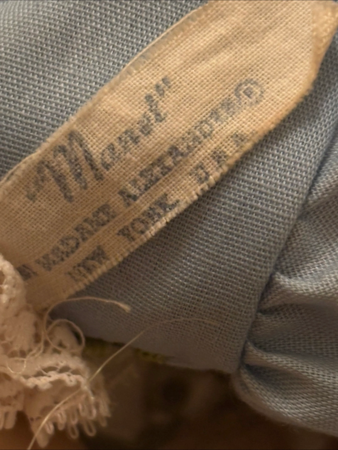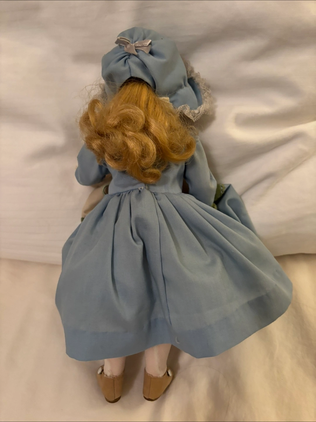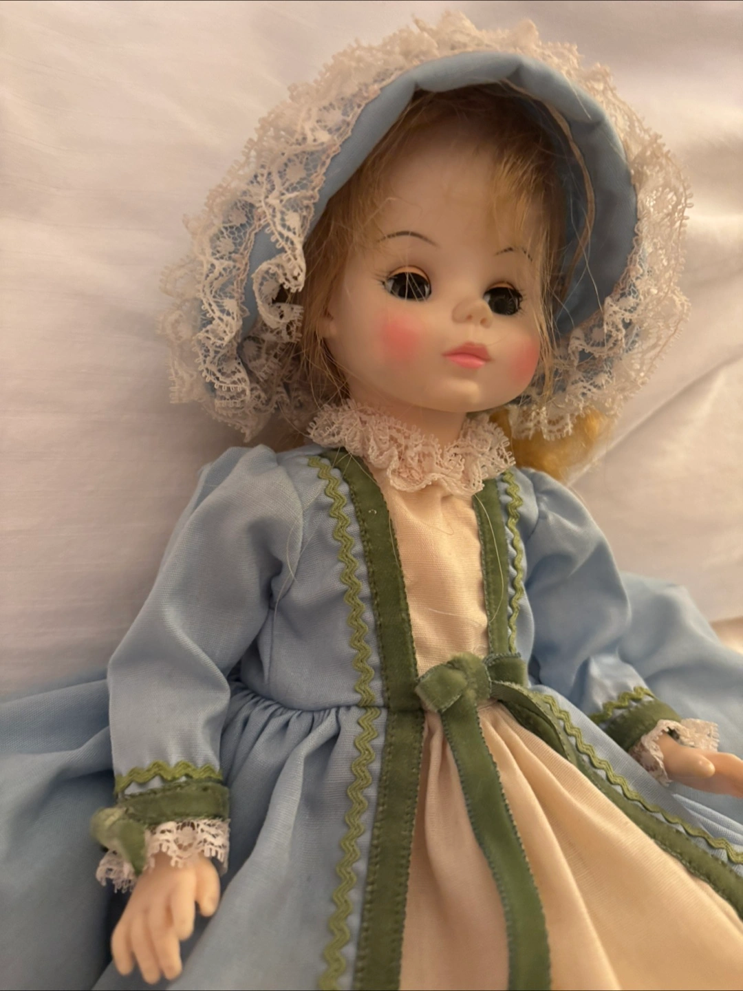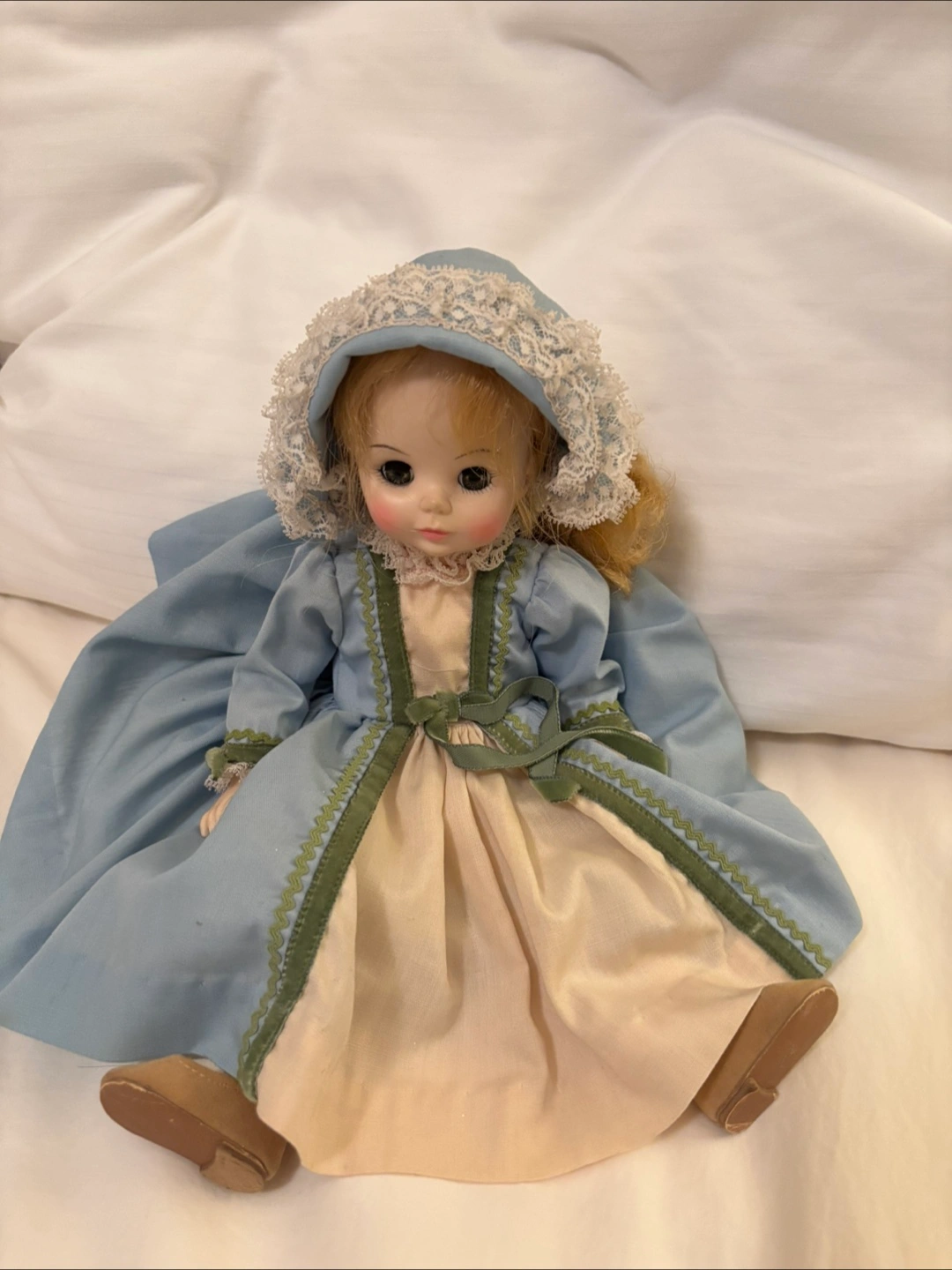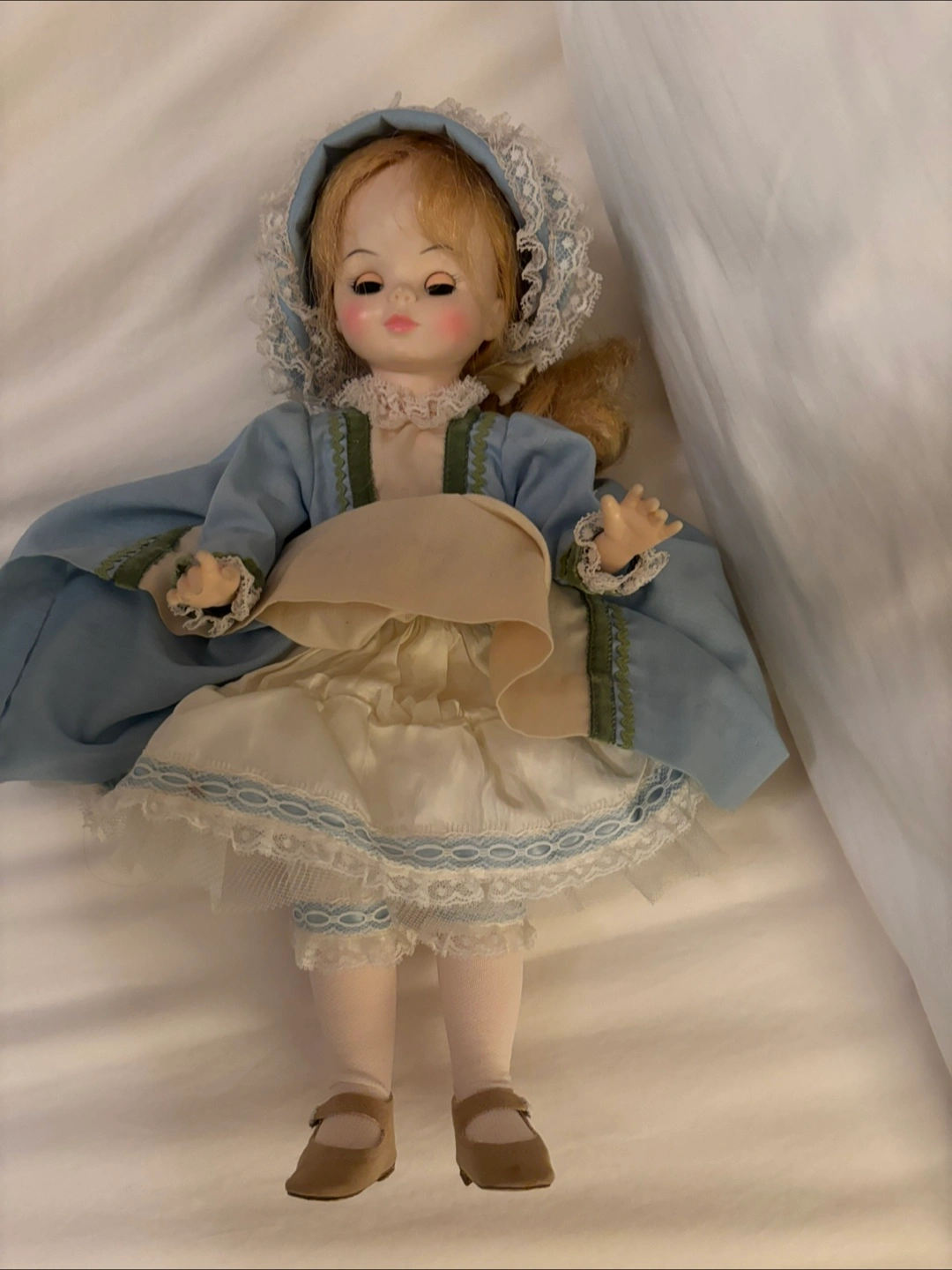 A lovely vintage doll dressed in a charming blue dress with lace detailing. She has blonde curly hair and cute little shoes. A sweet addition to any doll collection!