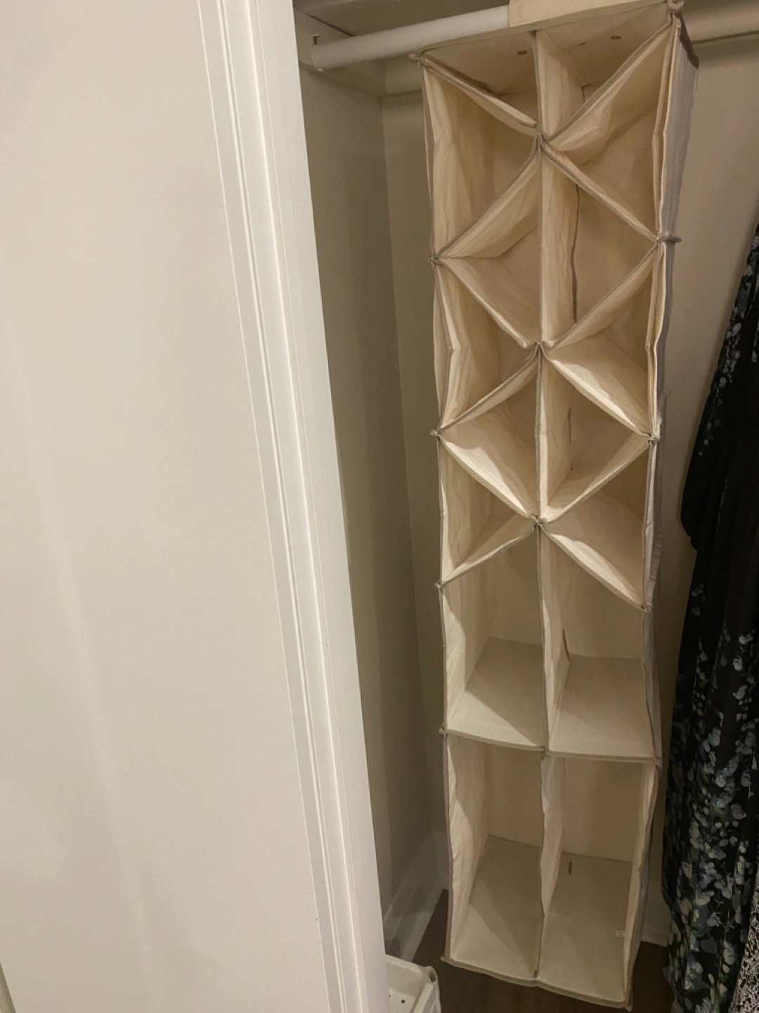 Declutter your closet with this handy hanging organizer! It's perfect for storing shoes, boots, or accessories. The neutral beige colour will fit seamlessly into any closet. This was purchased from bed bath and beyond and is good quality! It collapses for easy storage and transport when not in use.