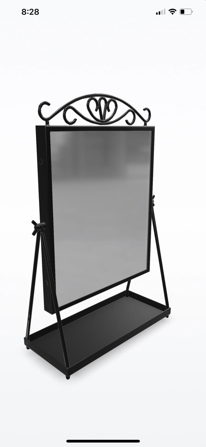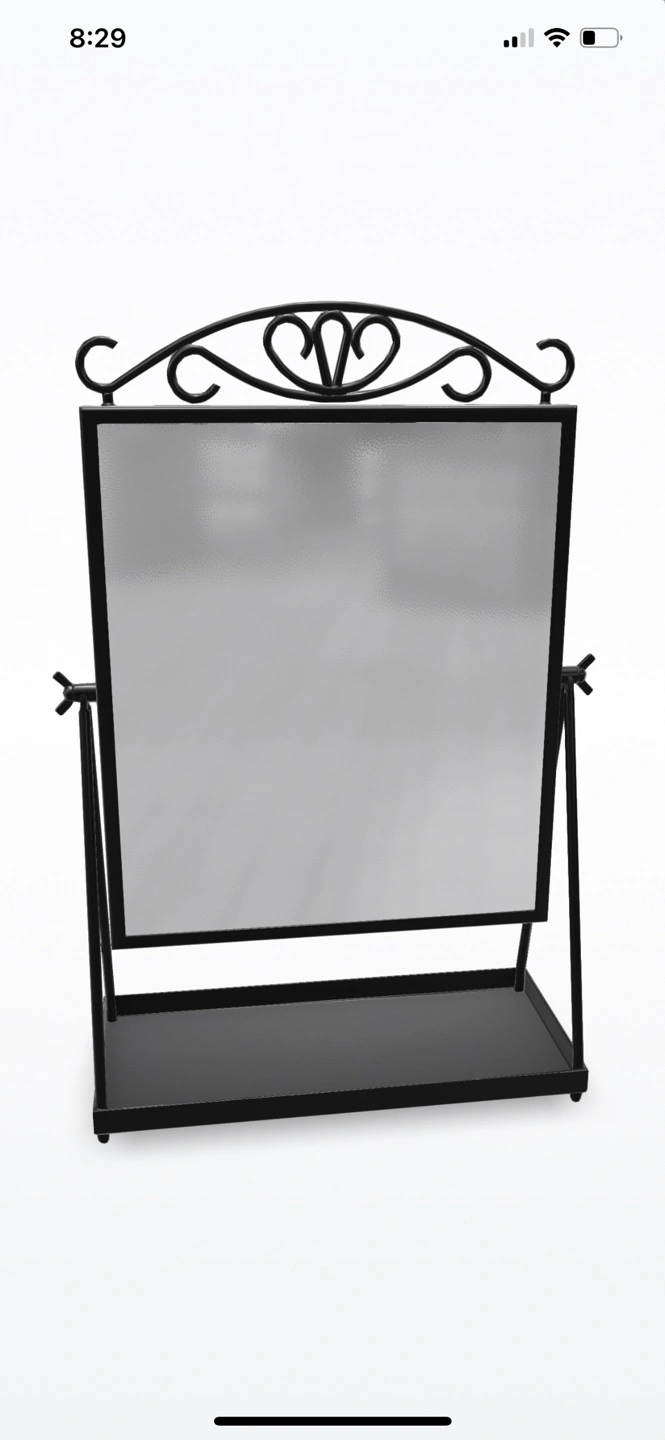 Here's a black vanity mirror with a stand. It's perfect for your bedroom or bathroom. The mirror is in great condition and ready for a new home.
