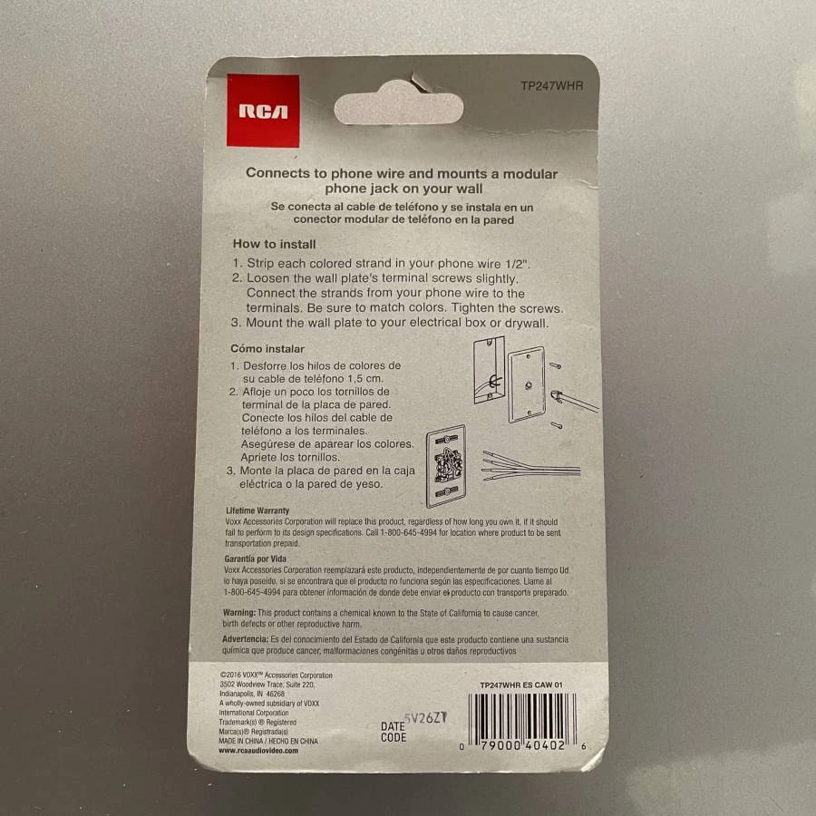 New RCA phone jack wall plate, model TP247WHR. It connects to phone wire and mounts to a modular phone jack on your wall. The package includes instructions for easy installation. Perfect for setting up a new phone line or replacing an old wall plate!