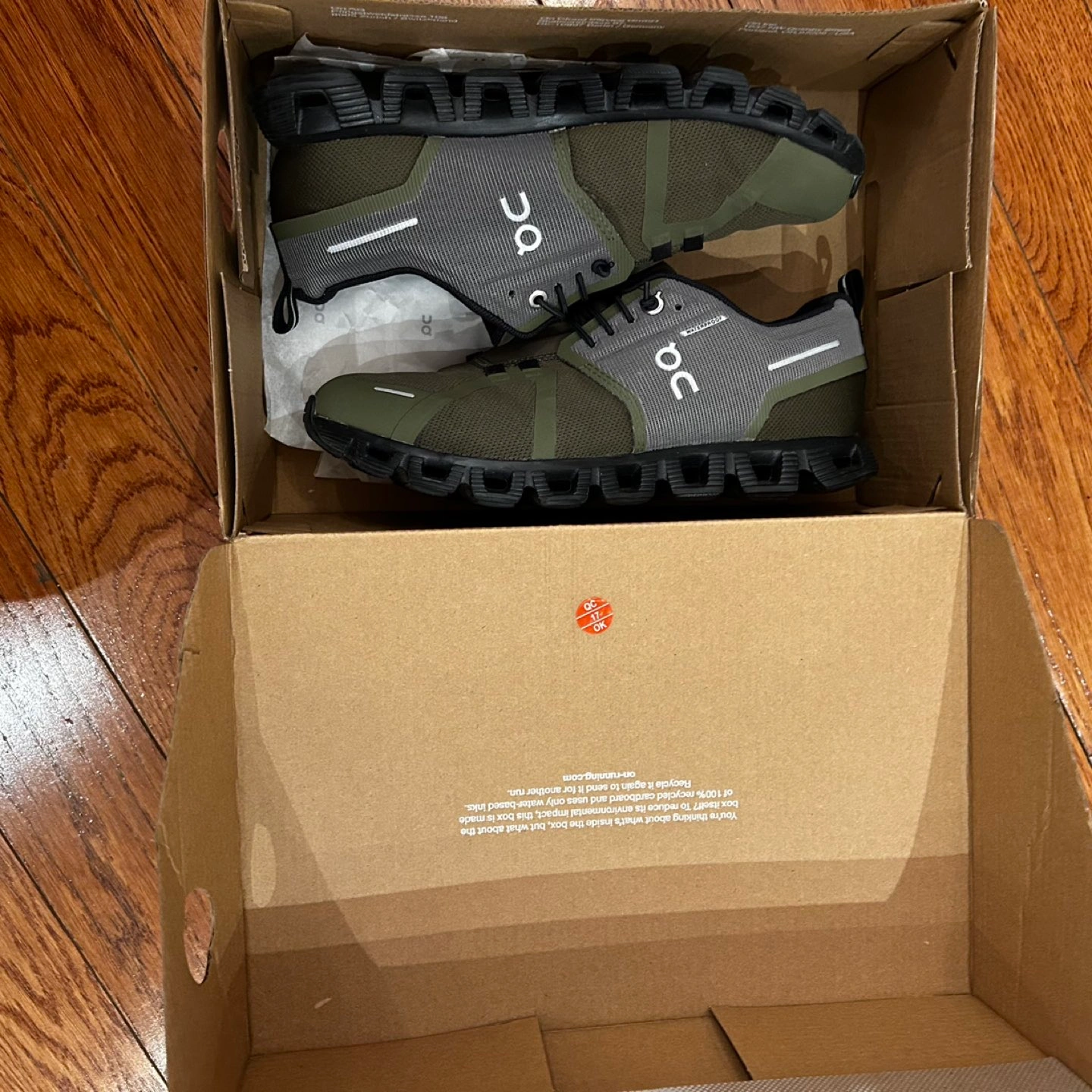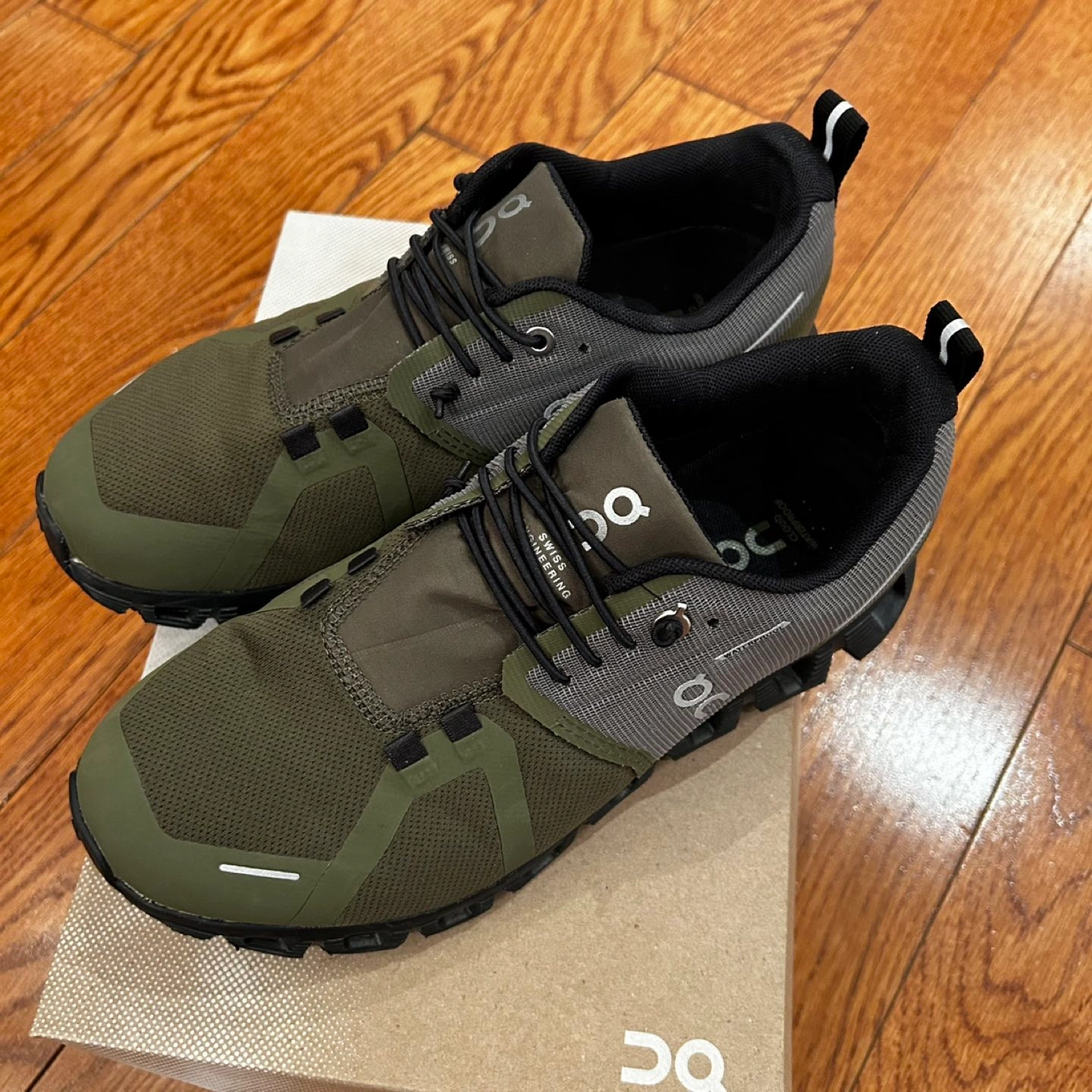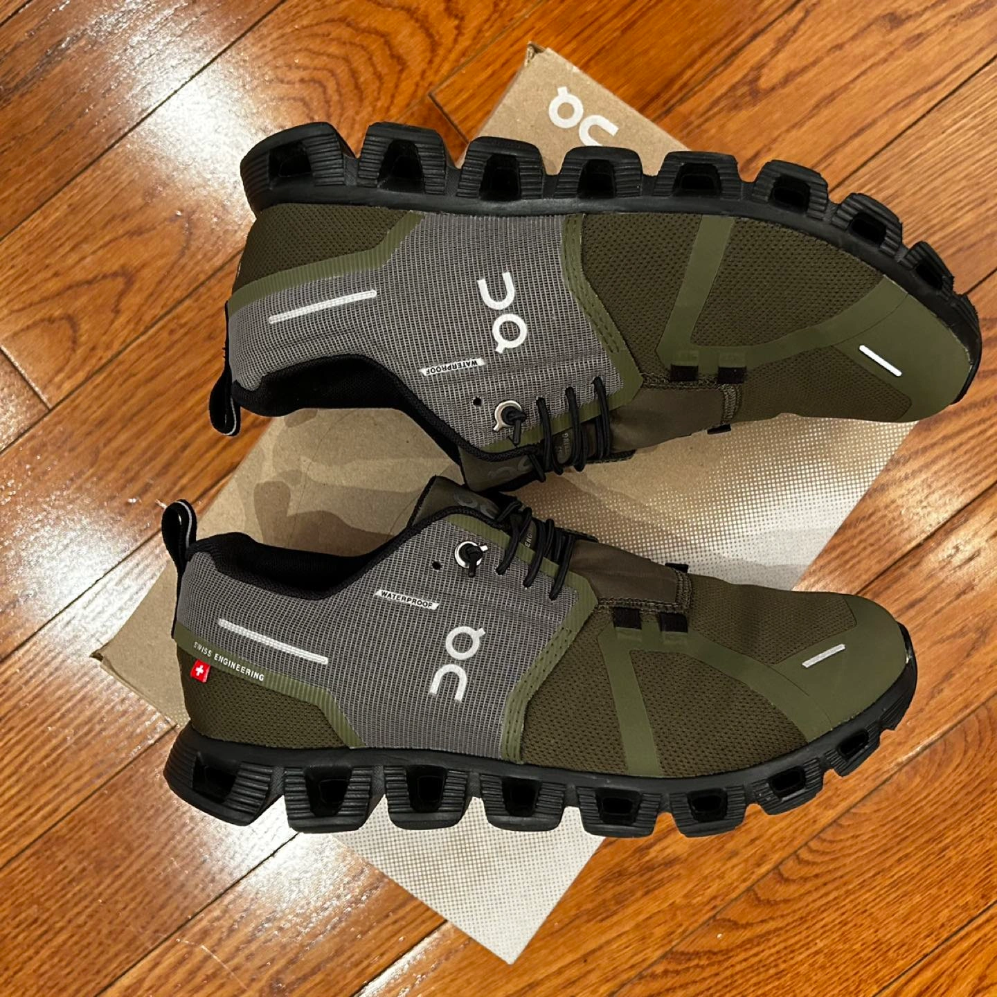 Cloud 5 Waterproof. Light and watertight shoe with Swiss-engineered superfoam that supports any runner and any running goal. Color: Kaki (kind of Olive green with detail in/Grey and Black)
