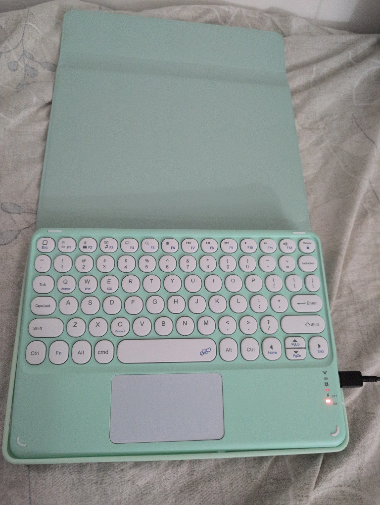 Selling a mint green Bluetooth keyboard that comes with a built-in touchpad! It's super handy for tablets and phones. Compatible with Android, Windows, and iOS devices. It's in great condition and ready to go!