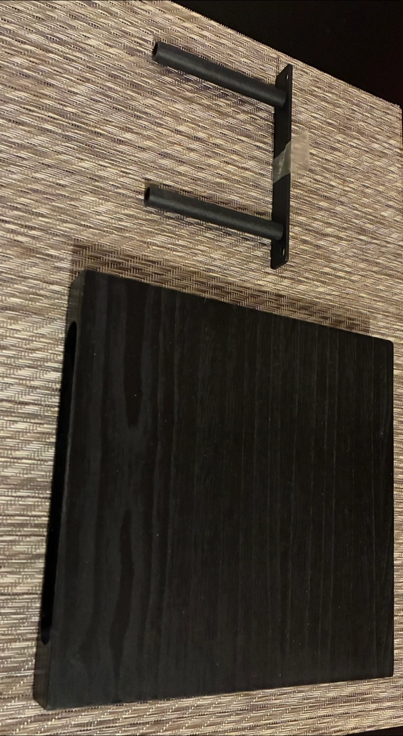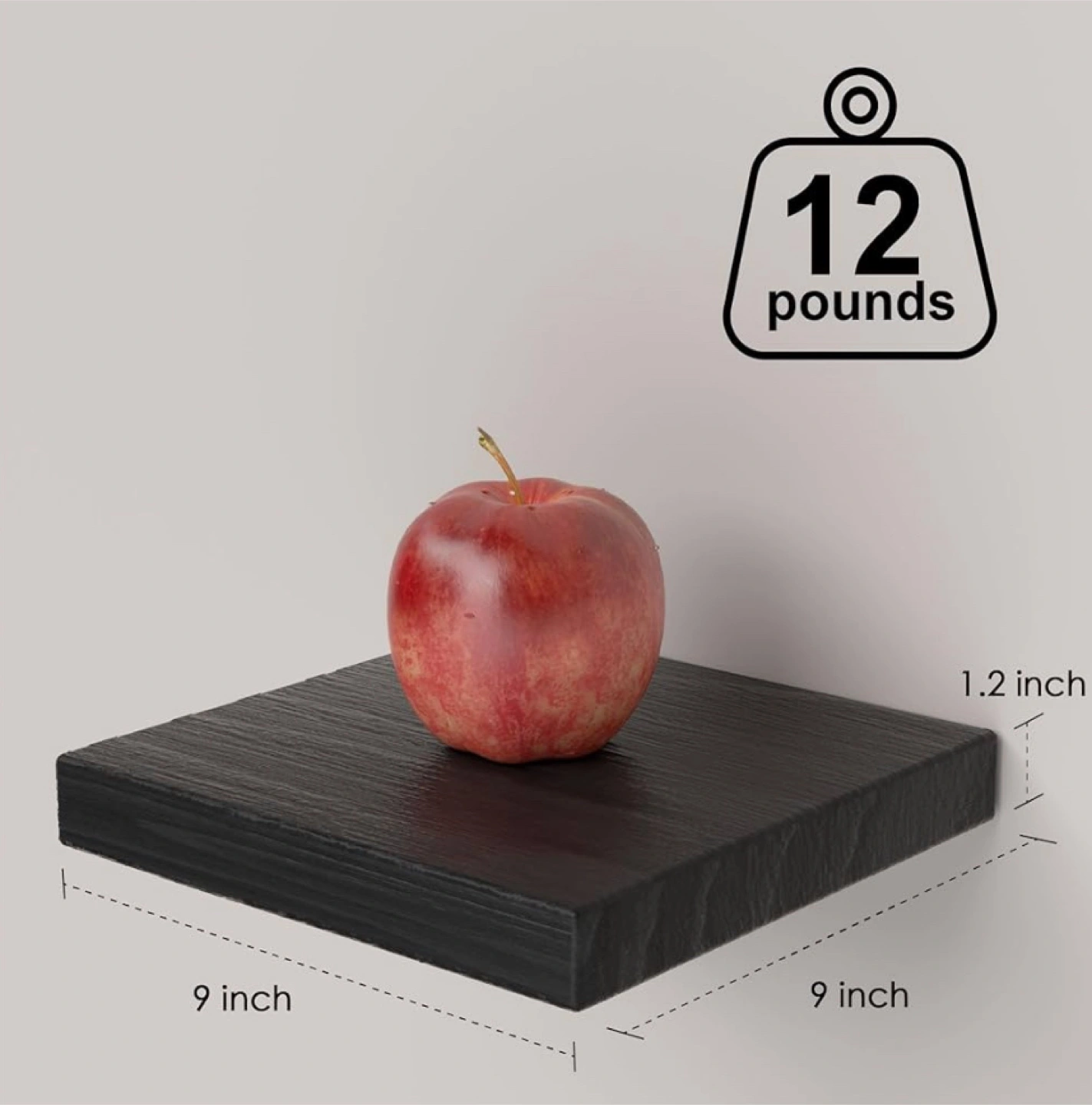 Selling a black floating wall shelf. It's 9 inches by 9 inches and about 1.2 inches thick. It can hold up to 12 pounds!