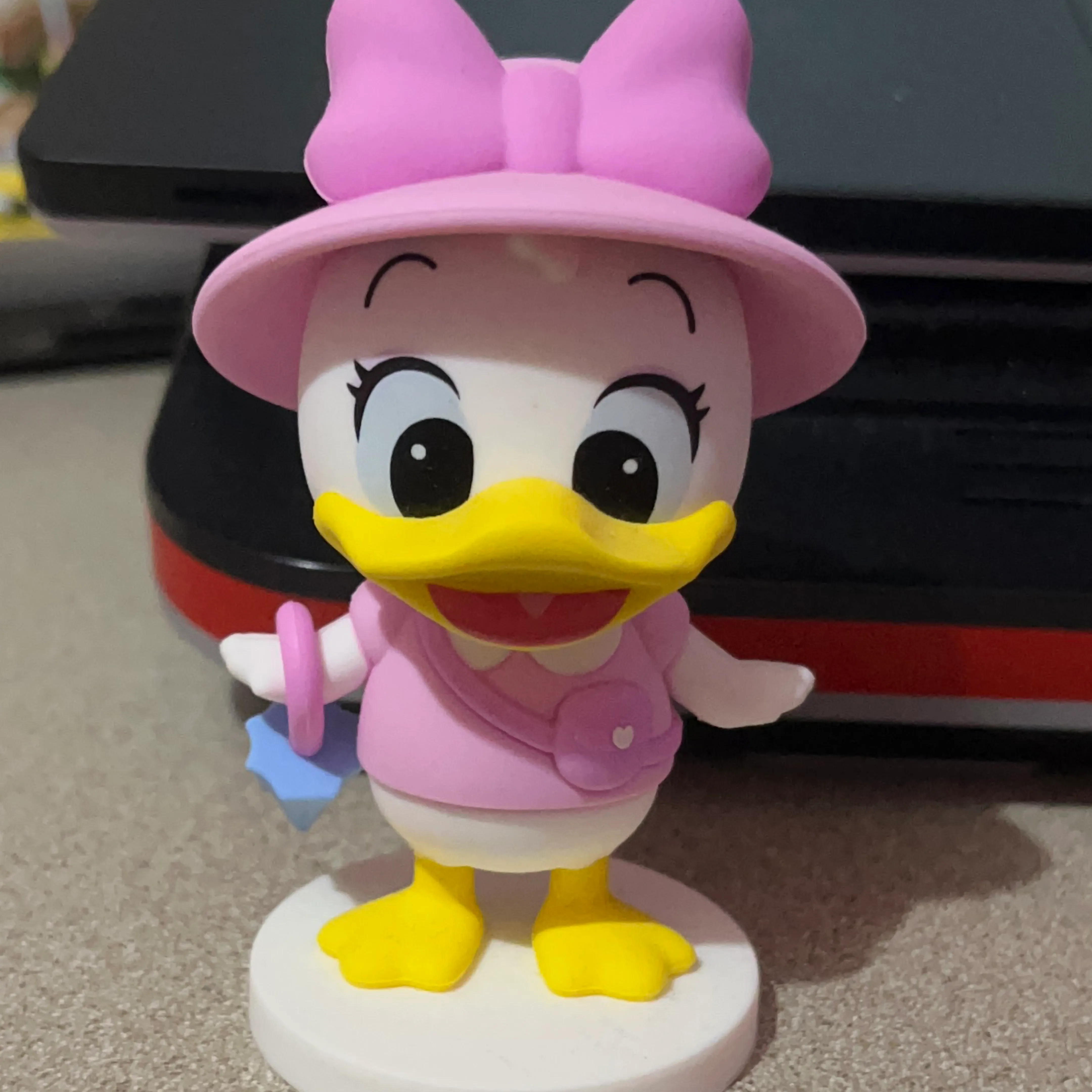 A cute Daisy Duck figurine! It's in great shape and would look adorable on a shelf or desk. It has a pink hat and dress with a little purse. It’s about 2-3 inches tall.