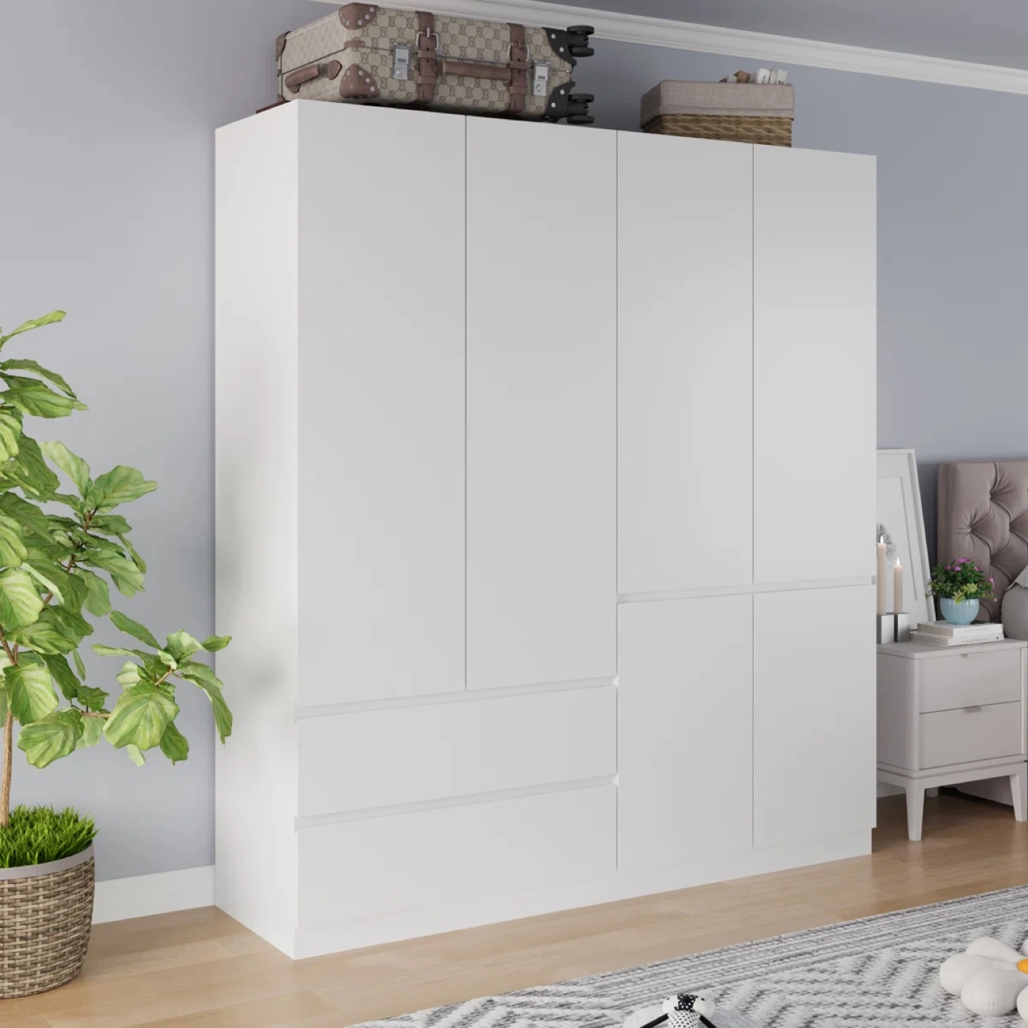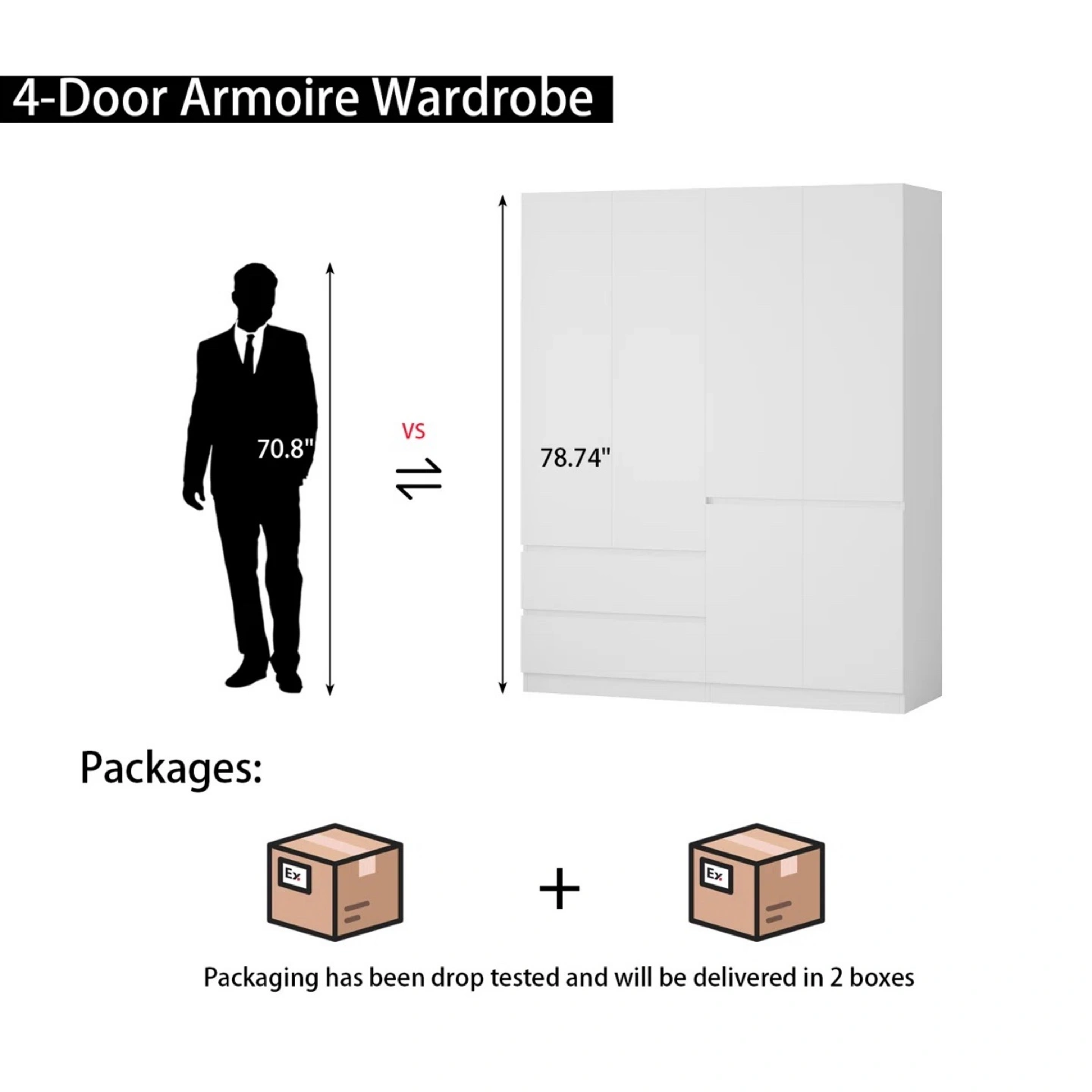 This is a white 4-door armoire wardrobe. It features a combination of doors and drawers for versatile storage. The overall dimensions are approximately 78.74" in height, 63" in width, and the drawers are about 10.2" in height. It's a great addition to any bedroom or closet space!