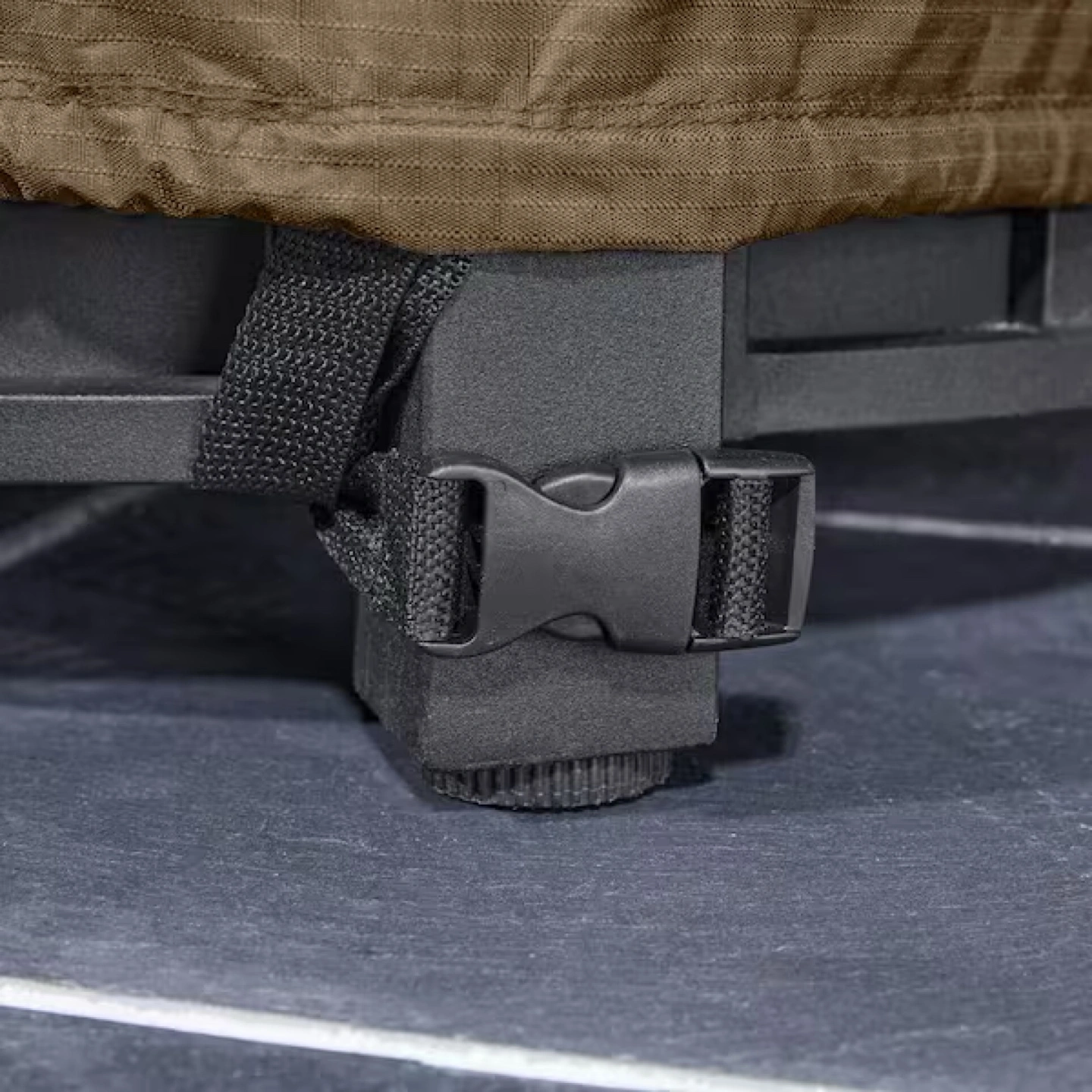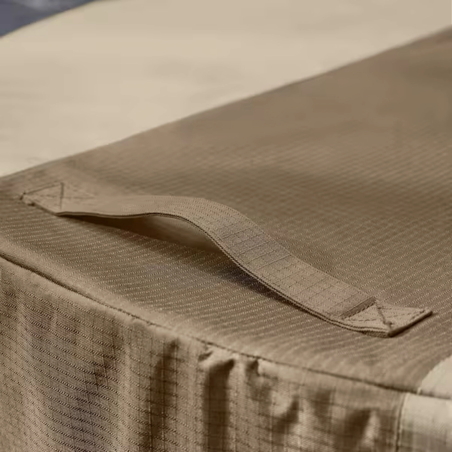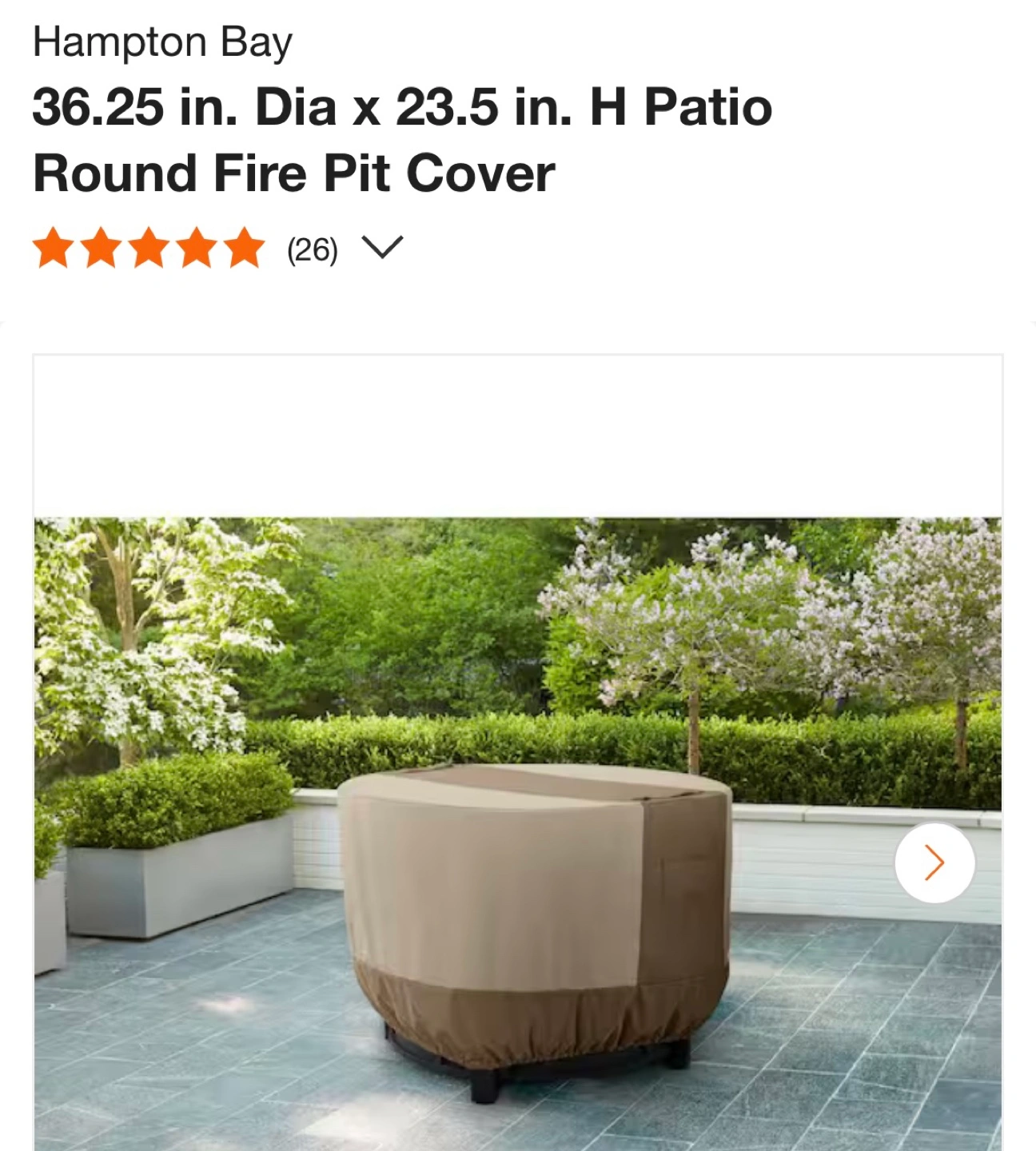 This is a Hampton Bay round fire pit cover. It's designed to fit a 36.25 inch diameter and 23.5 inch height patio fire pit. The cover comes in a neutral colour to blend with your outdoor decor. It also features a handle for easy removal and straps with buckles to secure it in place