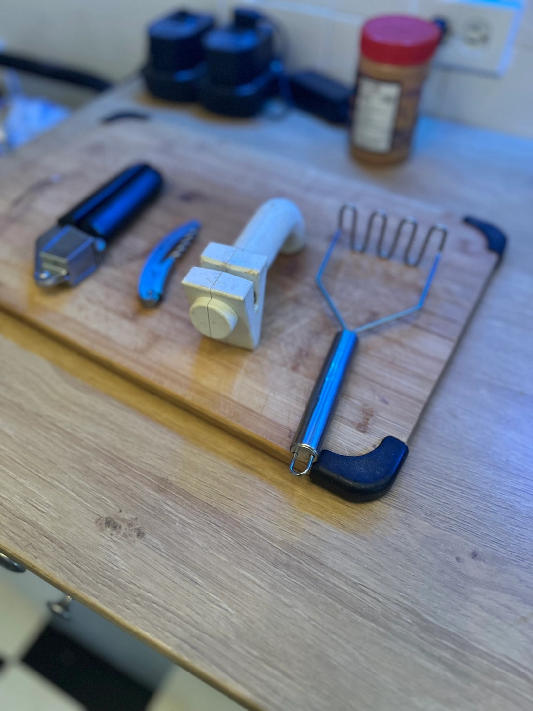 Selling a set of kitchen gadgets, including a wine opener, a name knife sharpener, and a potato masher. All in good condition and ready for a new home! The garlic press no longer available