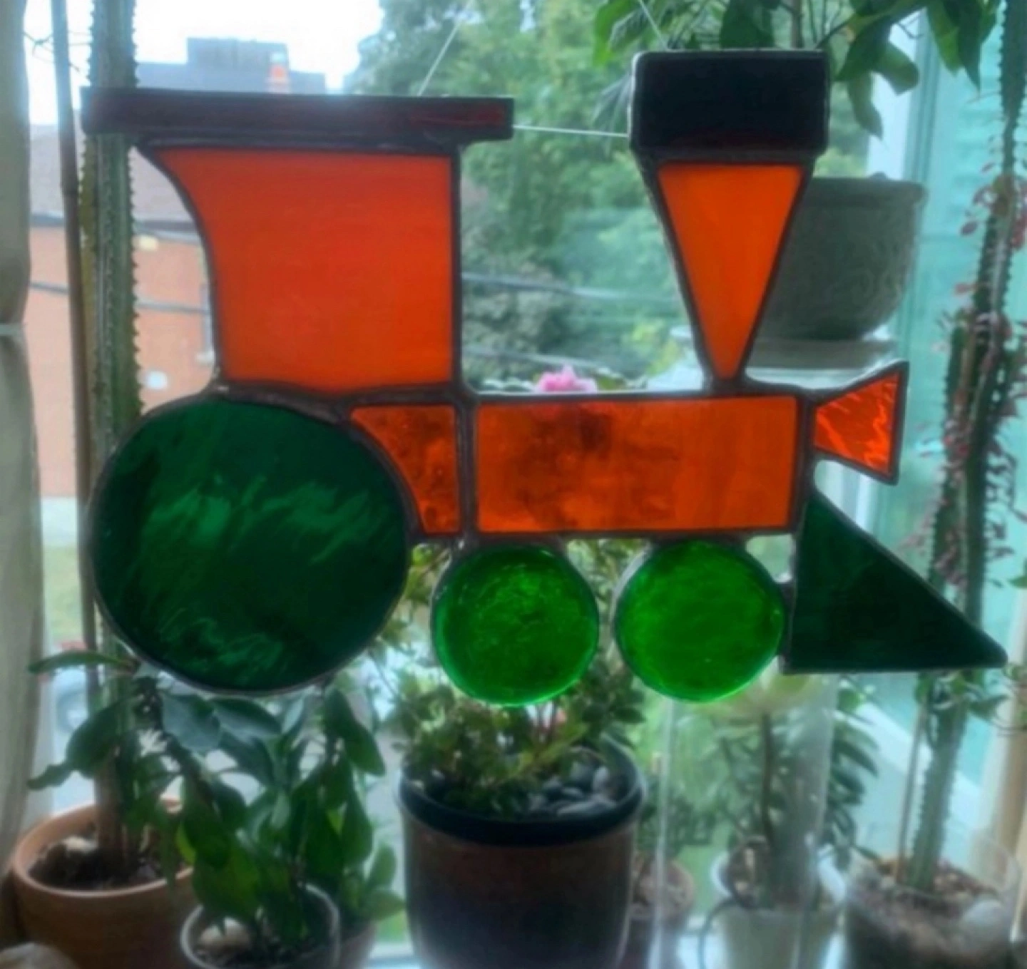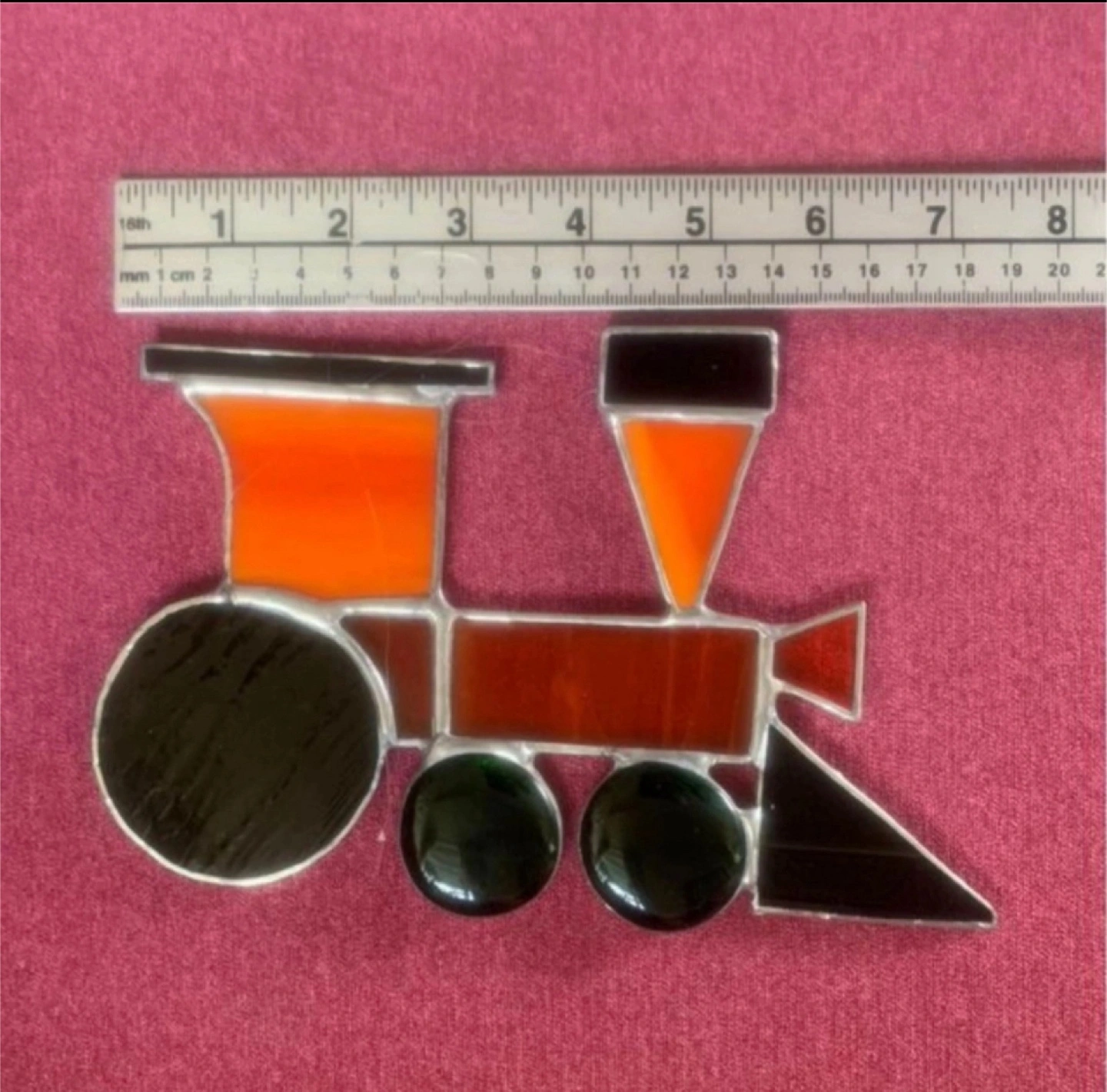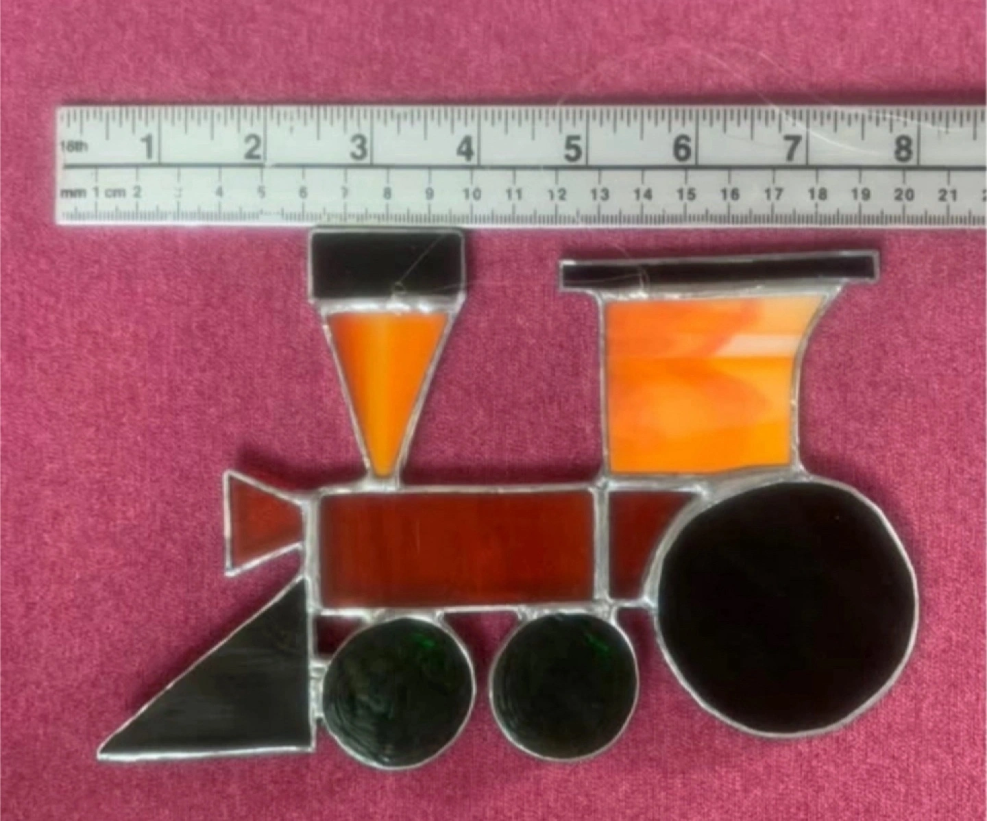 168Vintage stained glass train suncatcher. Circa mid 1980’s. It's made with different colours of glass, including orange, red, black, and green. Perfect for adding a touch of whimsy to any room. Pick up at Eglinton Ave east at Bayview.