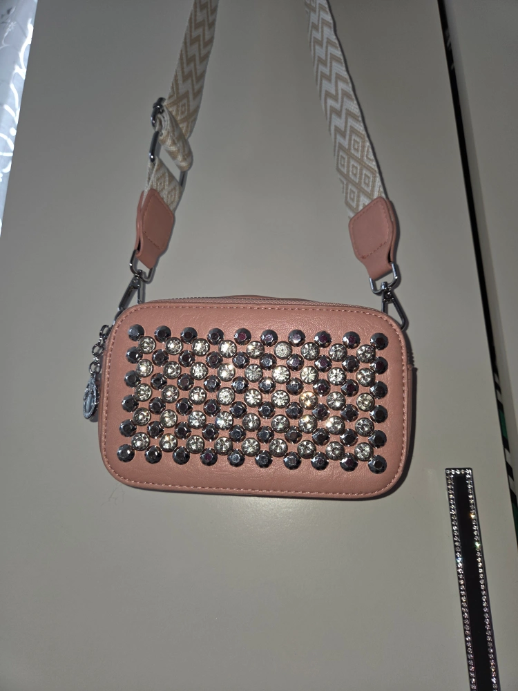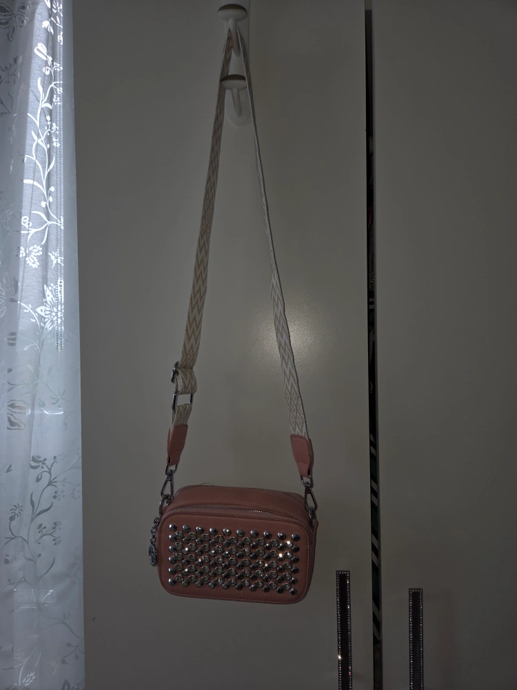 Here's a cute pink crossbody bag with studded detailing! It has a stylish strap and is the perfect size for carrying your essentials. It's in great condition and ready for a new home!